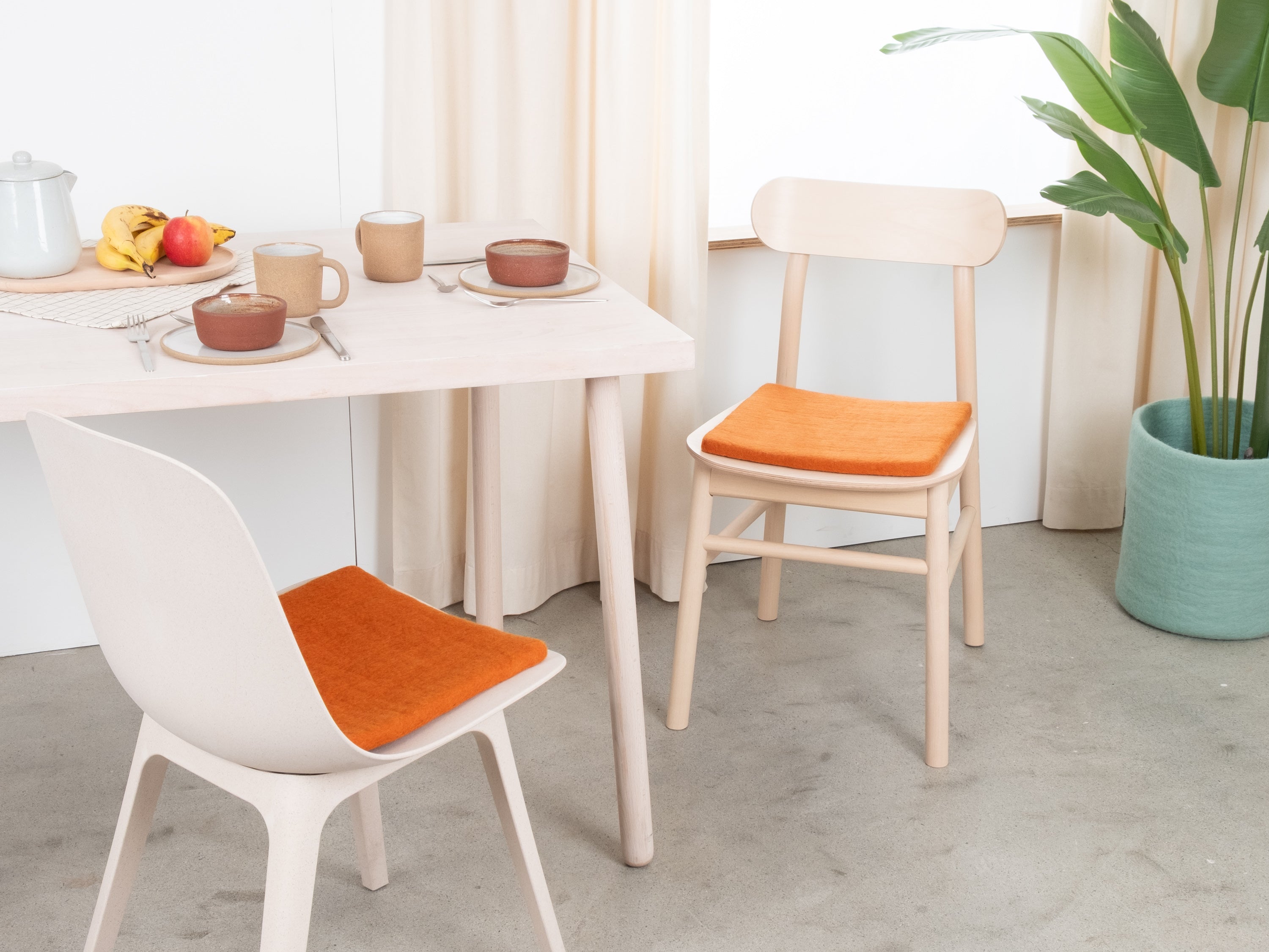 Die orangefarbene, flache Sitzauflage Afra bringt Wärme und Weichheit auf deinen Lieblingsstuhl. Gefertigt aus reiner Schurwolle, von Hand in Nepal hergestellt und unter fairen Bedingungen produziert. myfelt Sitzauflagen sind wasser- und schmutzabweisend und beidseitig verwendbar.