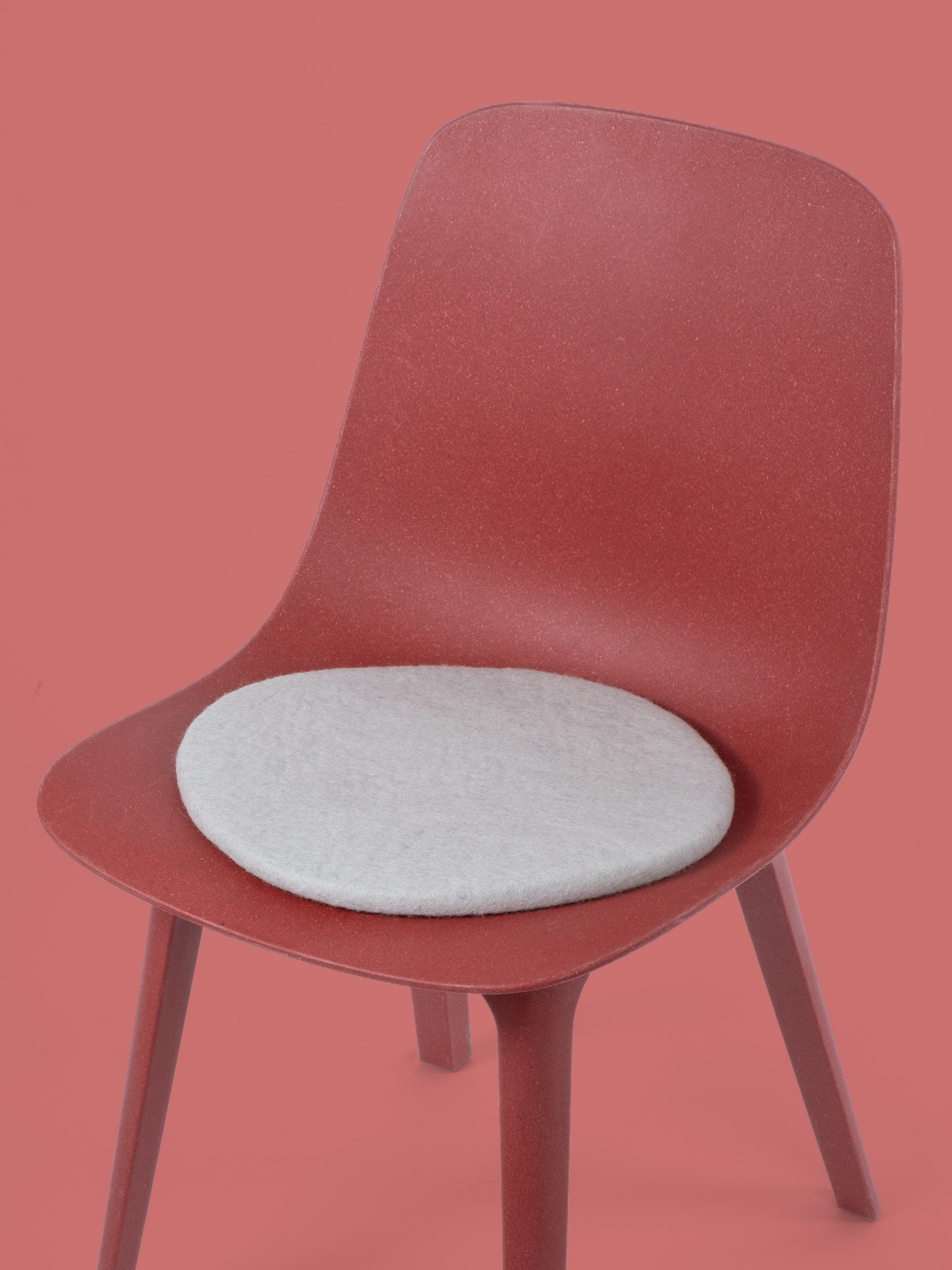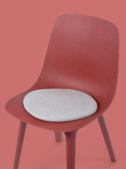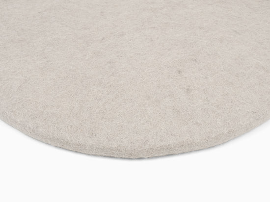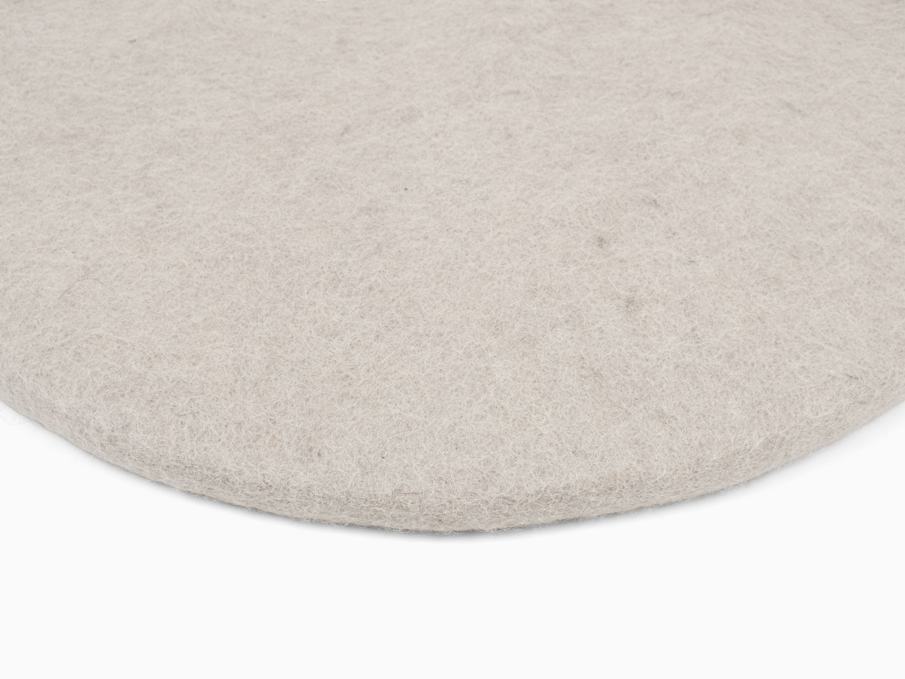 Runde, hellgraue flache Sitzauflage aus reiner Schurwolle.