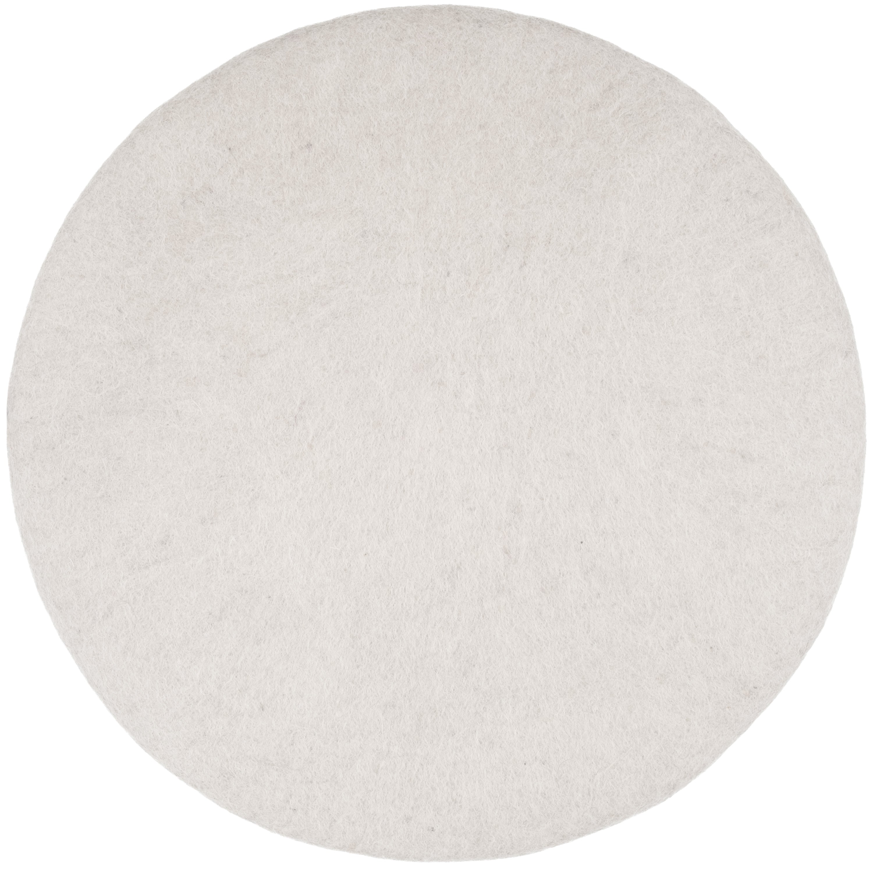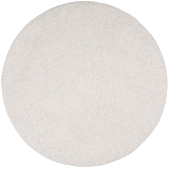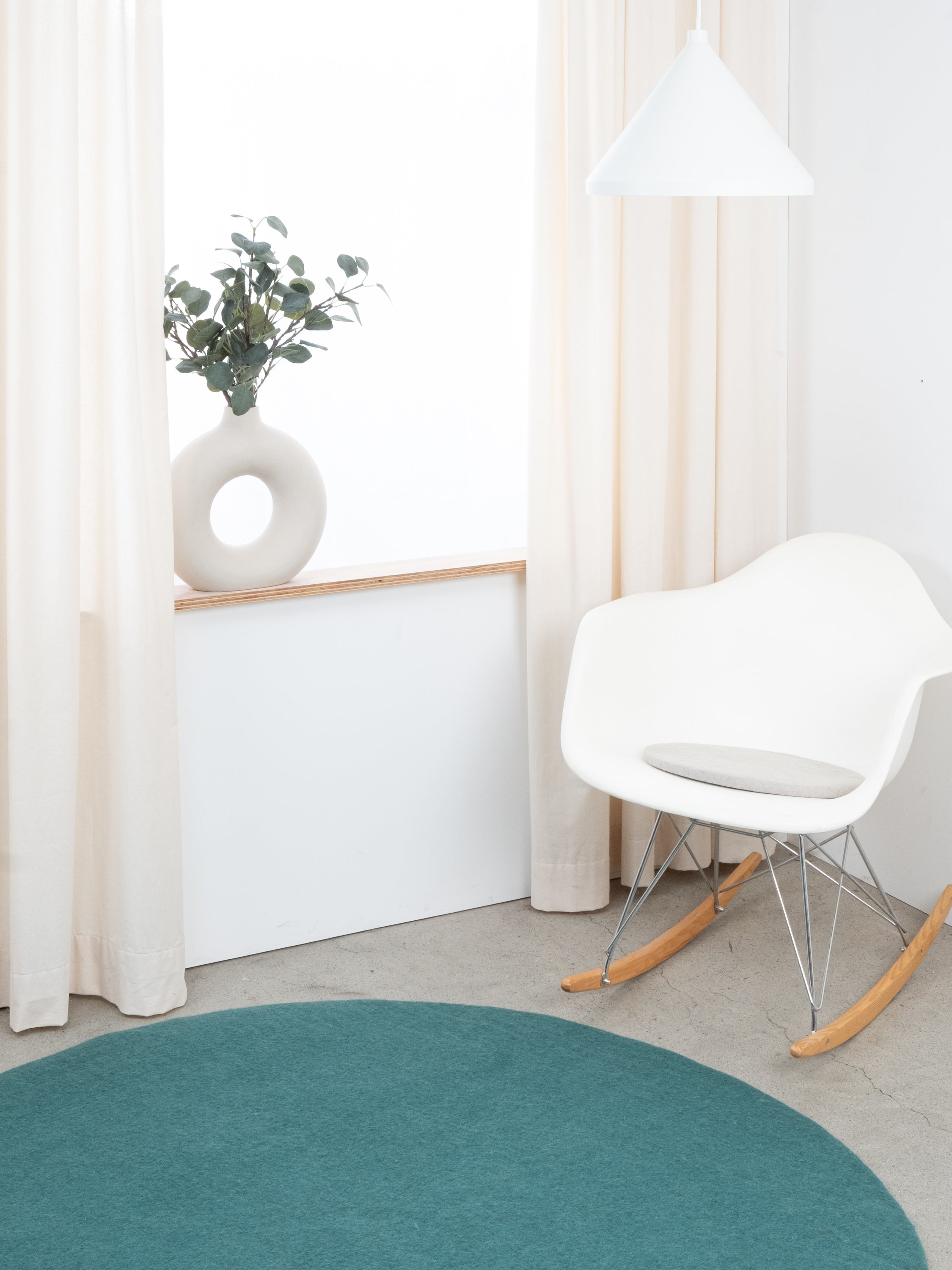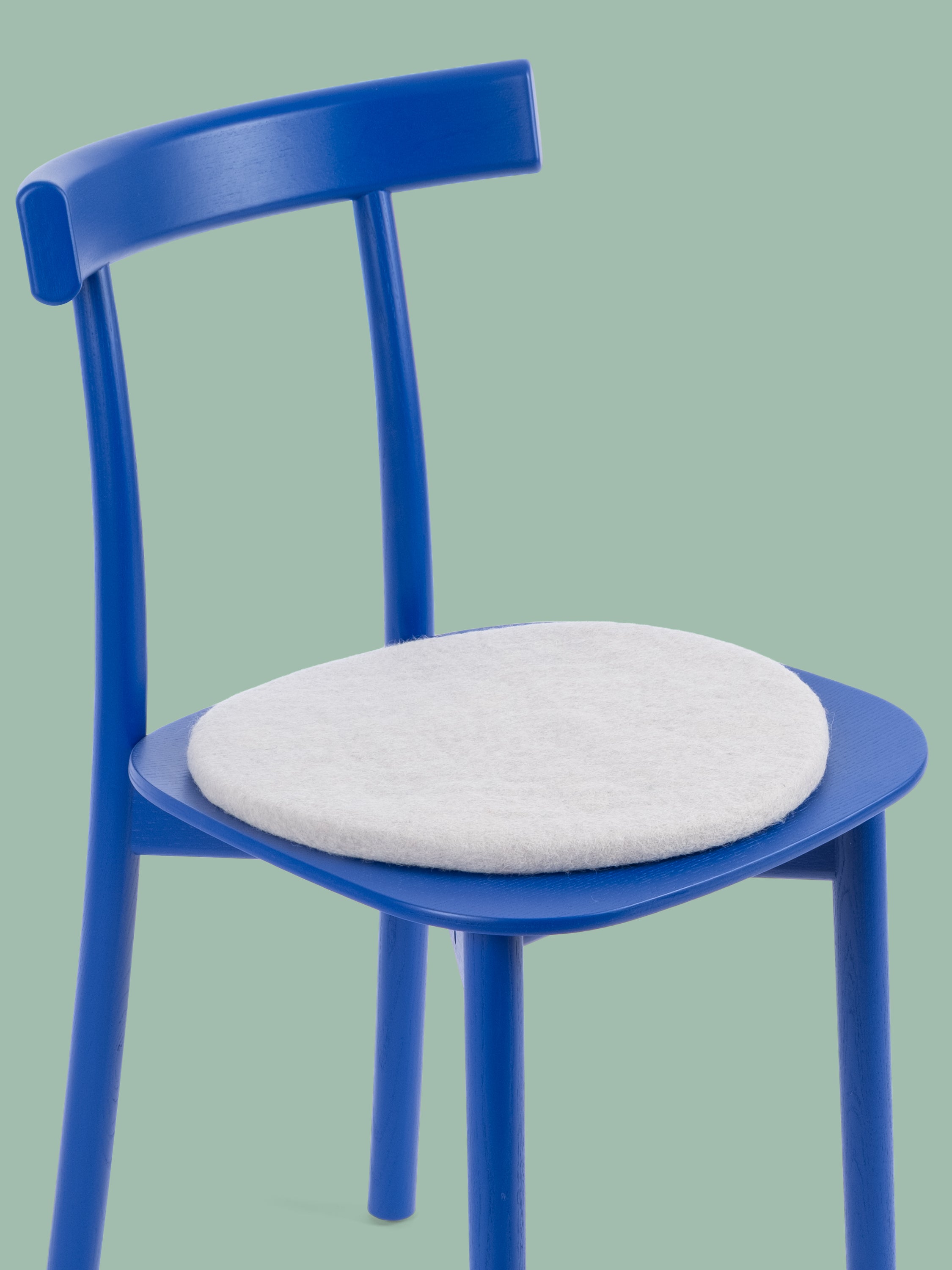 Runde, hellgraue flache Sitzauflage aus reiner Schurwolle.