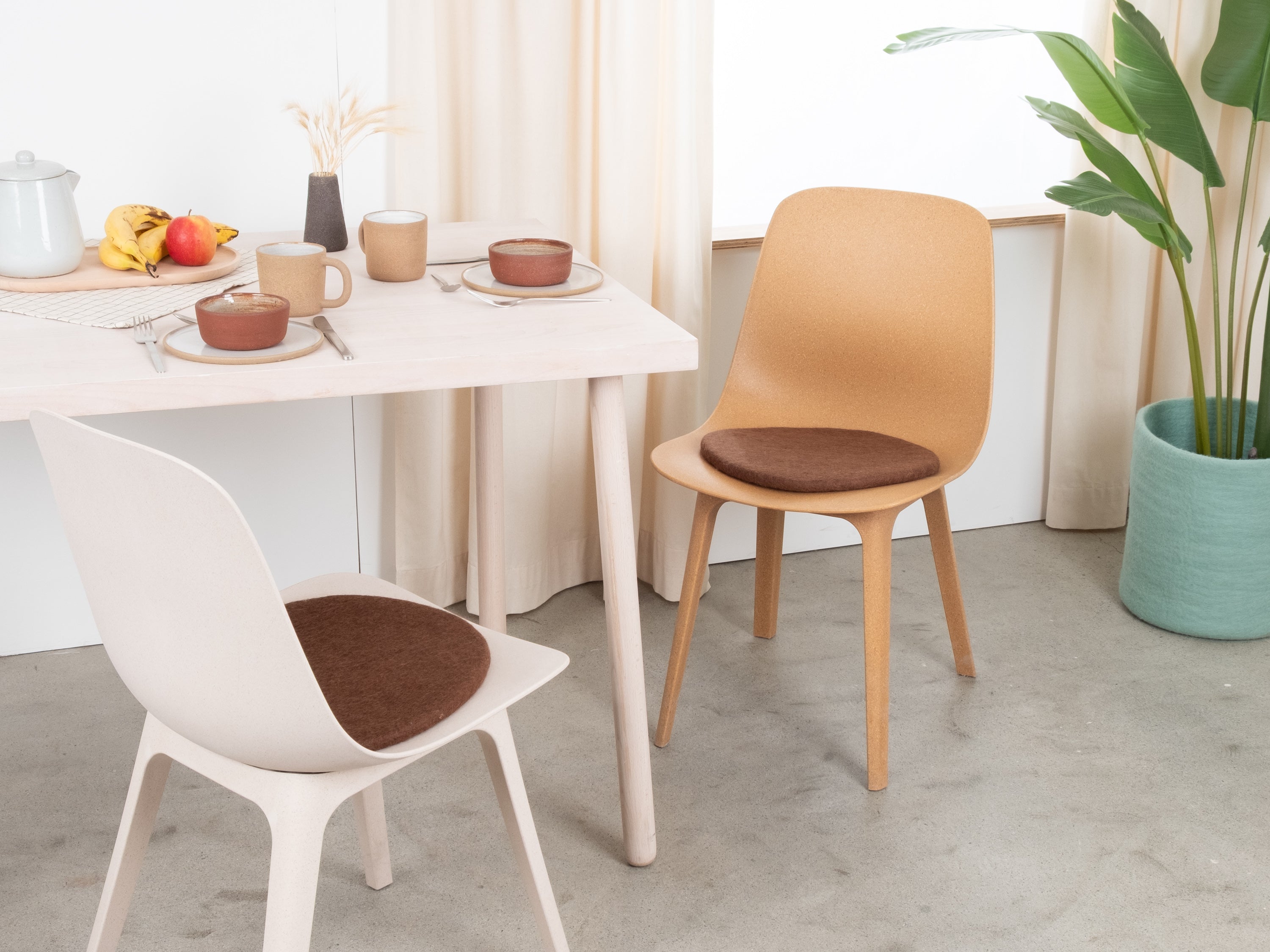Runde, braune flache Sitzauflage aus reiner Schurwolle.