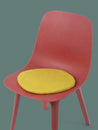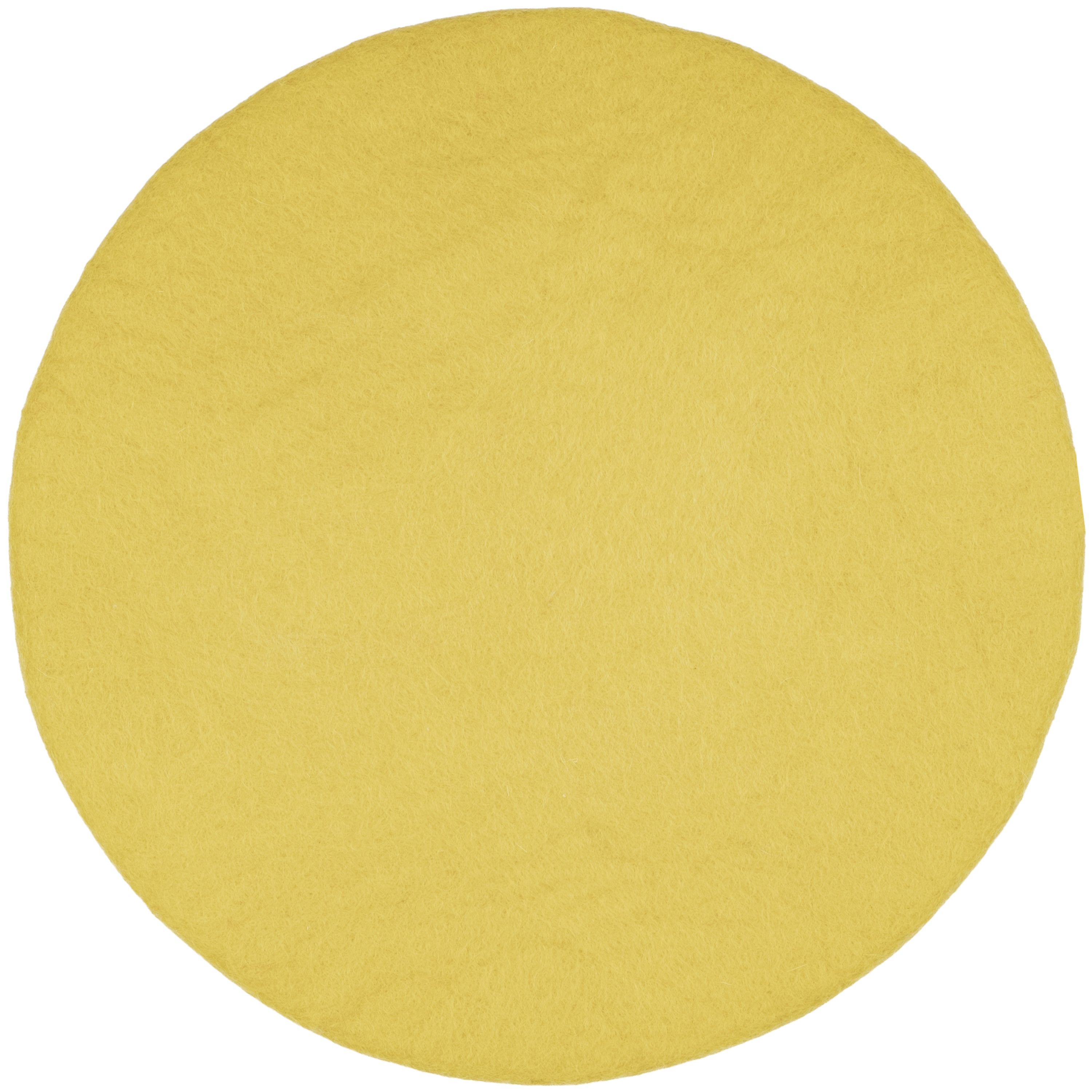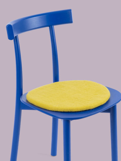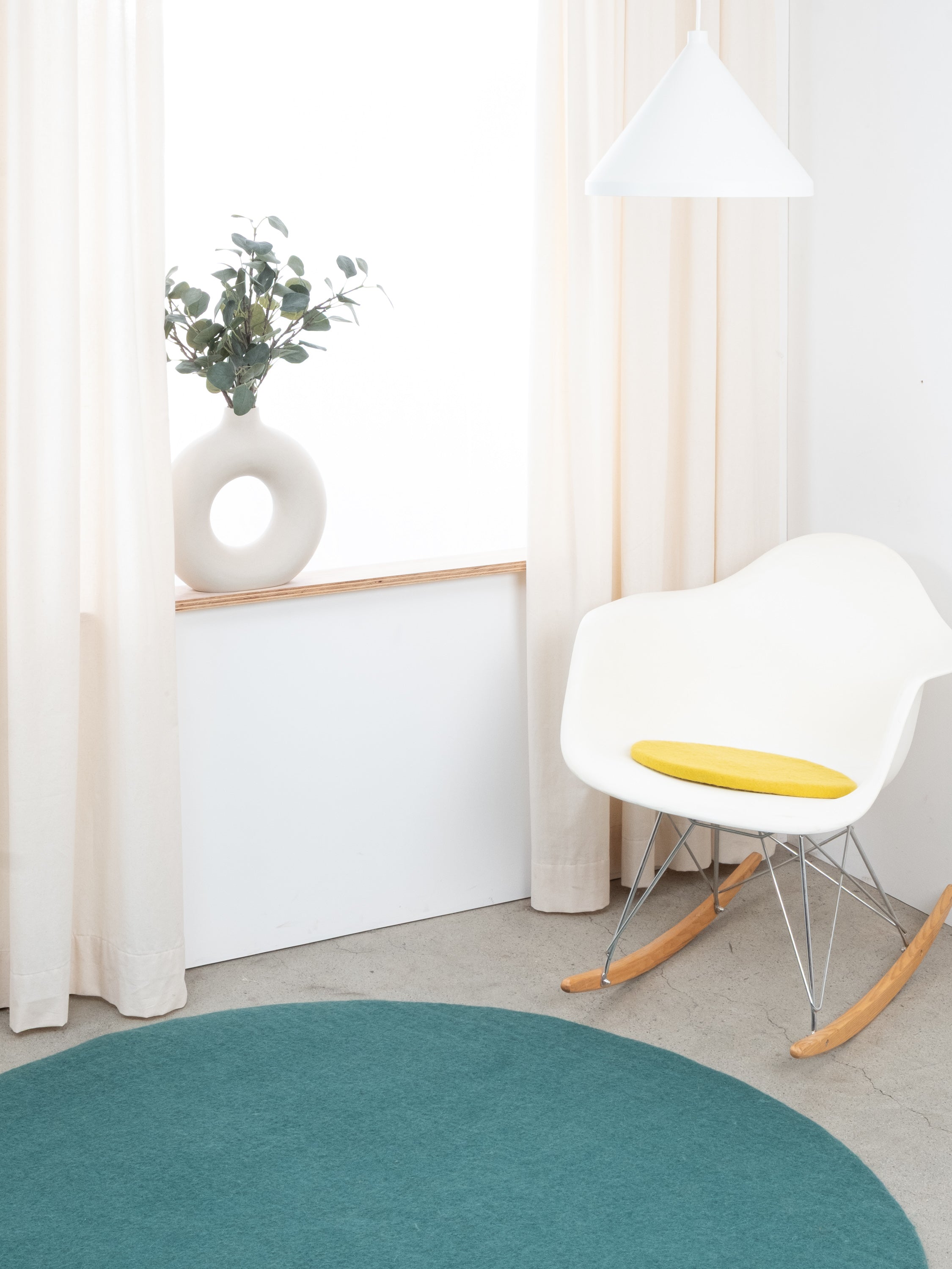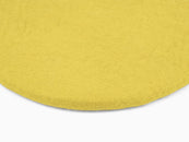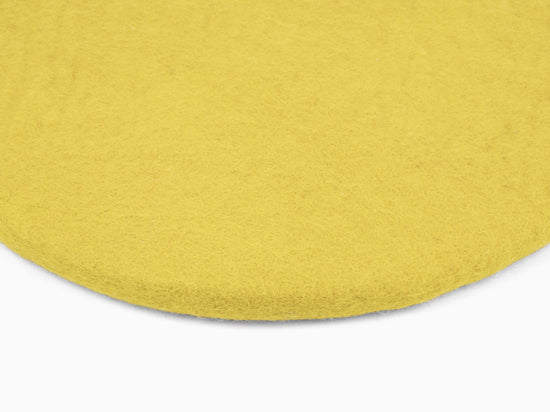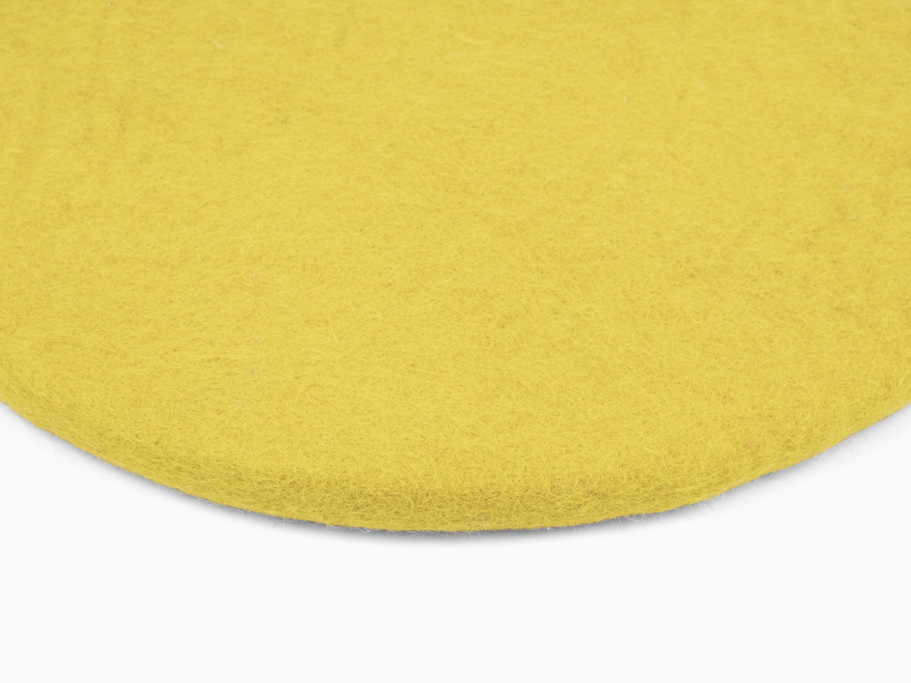Runde, grüngelbe flache Sitzauflage aus reiner Schurwolle.
