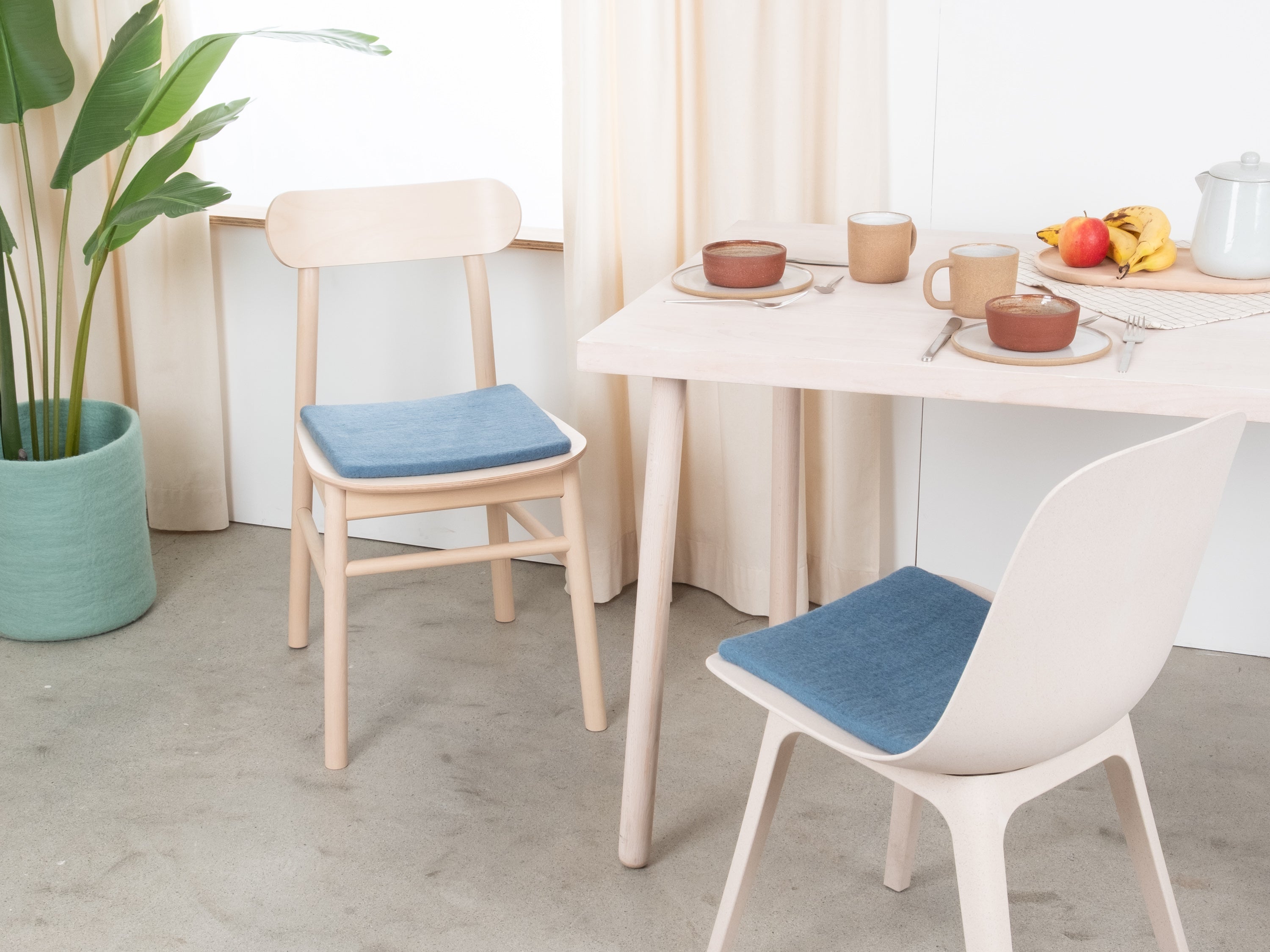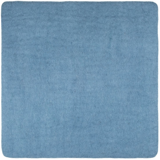Quadratische, blaue flache Sitzauflage aus reiner Schurwolle.