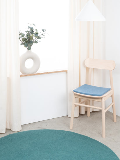 Die blaue, flache Sitzauflage Nilo bringt Wärme und Weichheit auf deinen Lieblingsstuhl. Gefertigt aus reiner Schurwolle, von Hand in Nepal hergestellt und unter fairen Bedingungen produziert. myfelt Sitzauflagen sind wasser- und schmutzabweisend und beidseitig verwendbar.