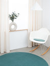 Runde, aquafarbene flache Sitzauflage aus reiner Schurwolle.