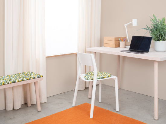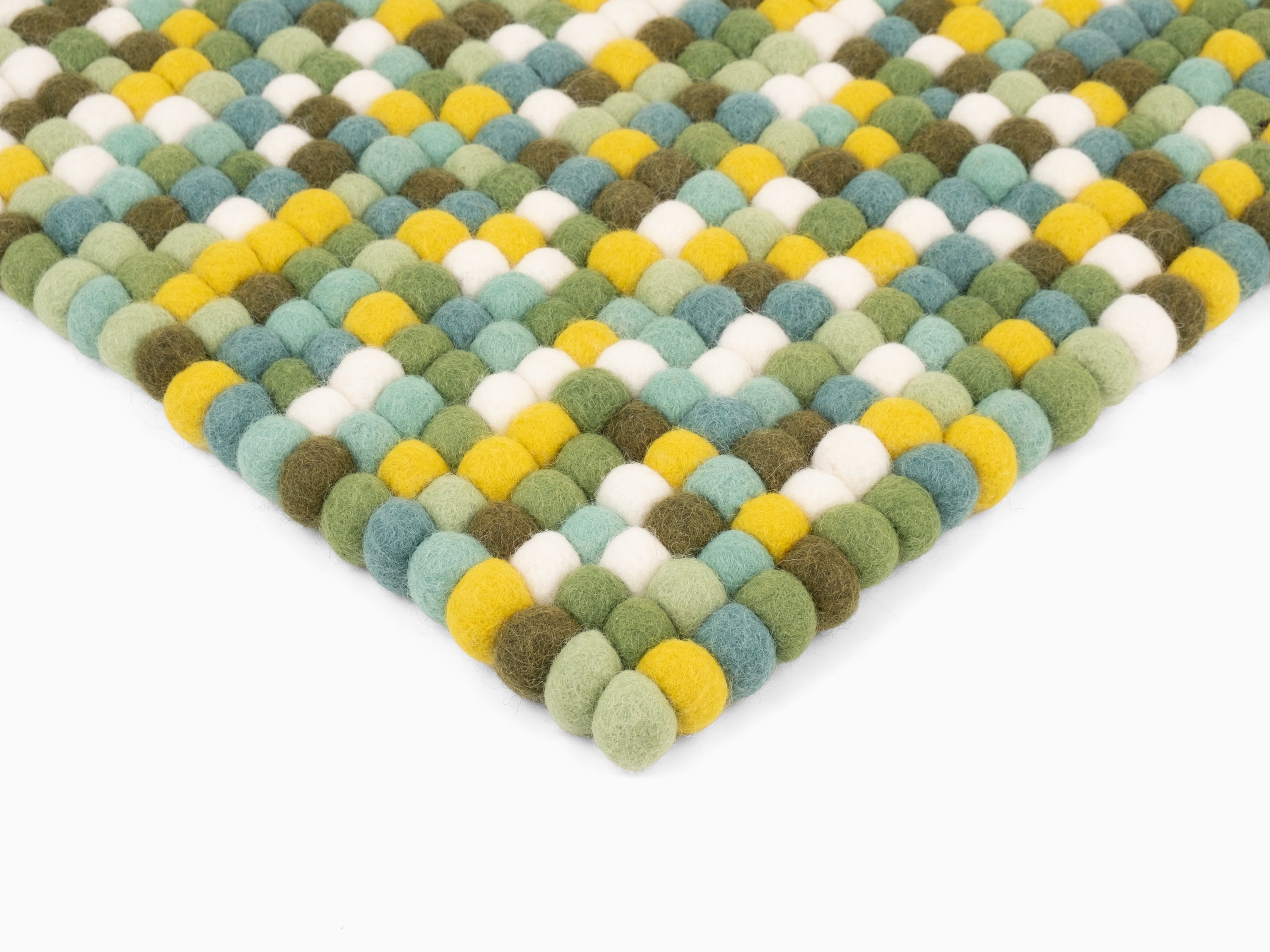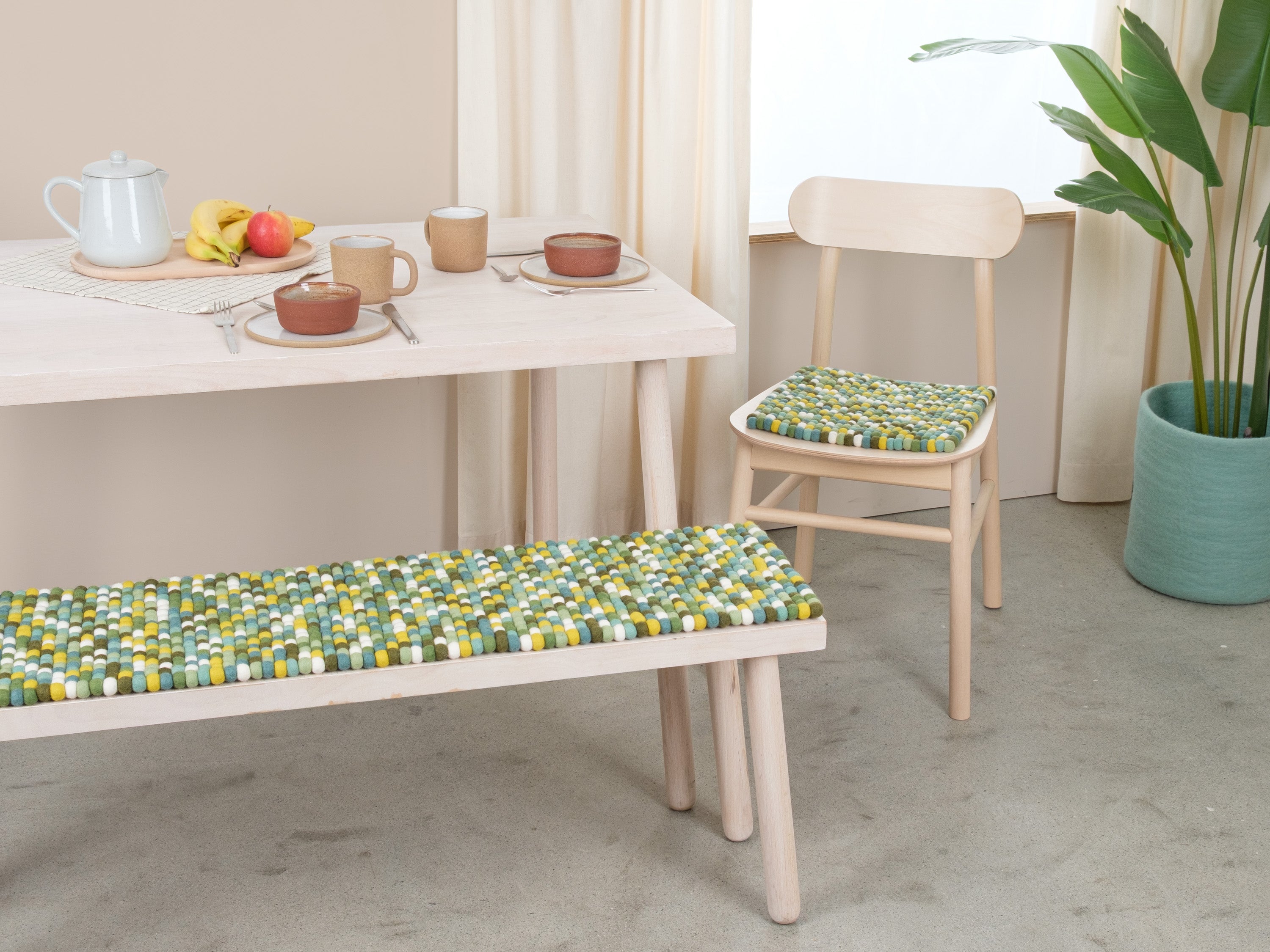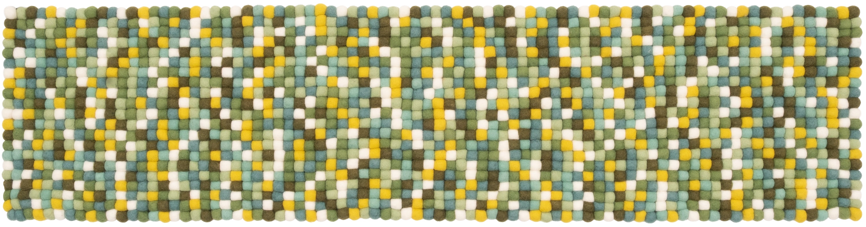 Mehrfarbige Filzkugel-Bankauflage aus Schurwolle in Ihrem Wunschmaß.