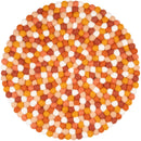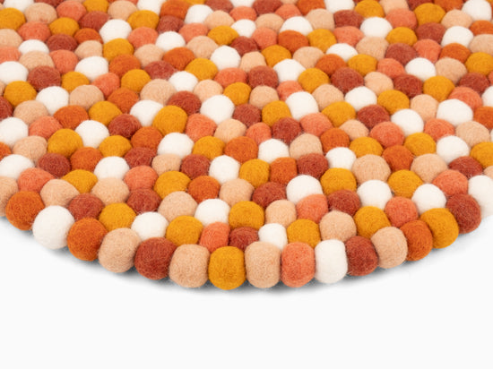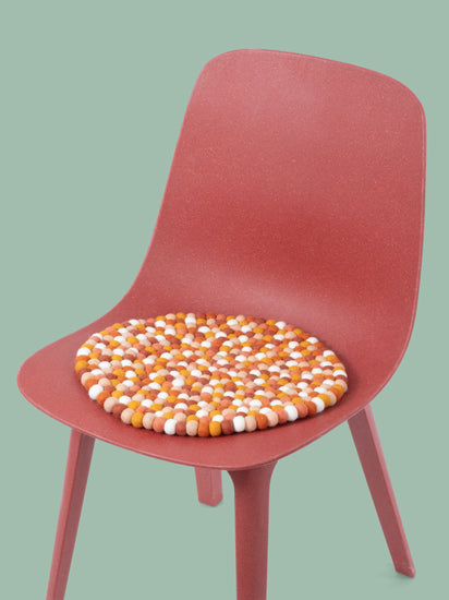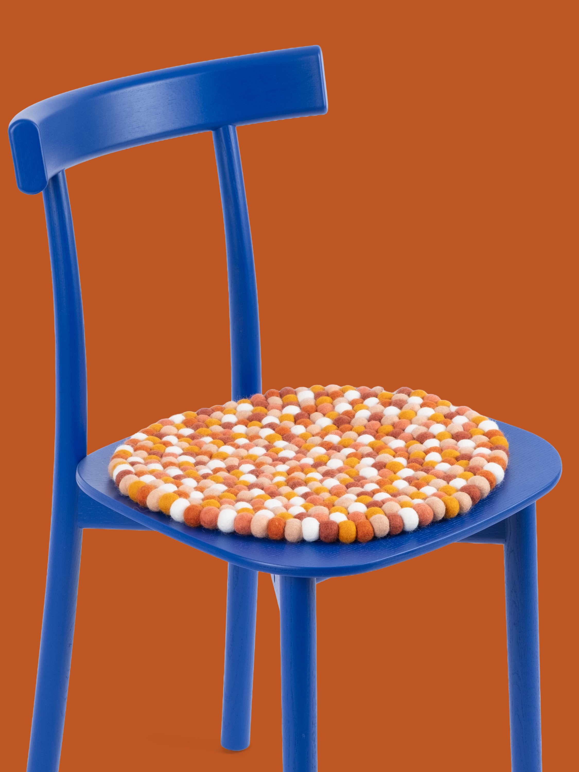 Runde, multifarbene Sitzauflage aus reiner Schurwolle.