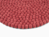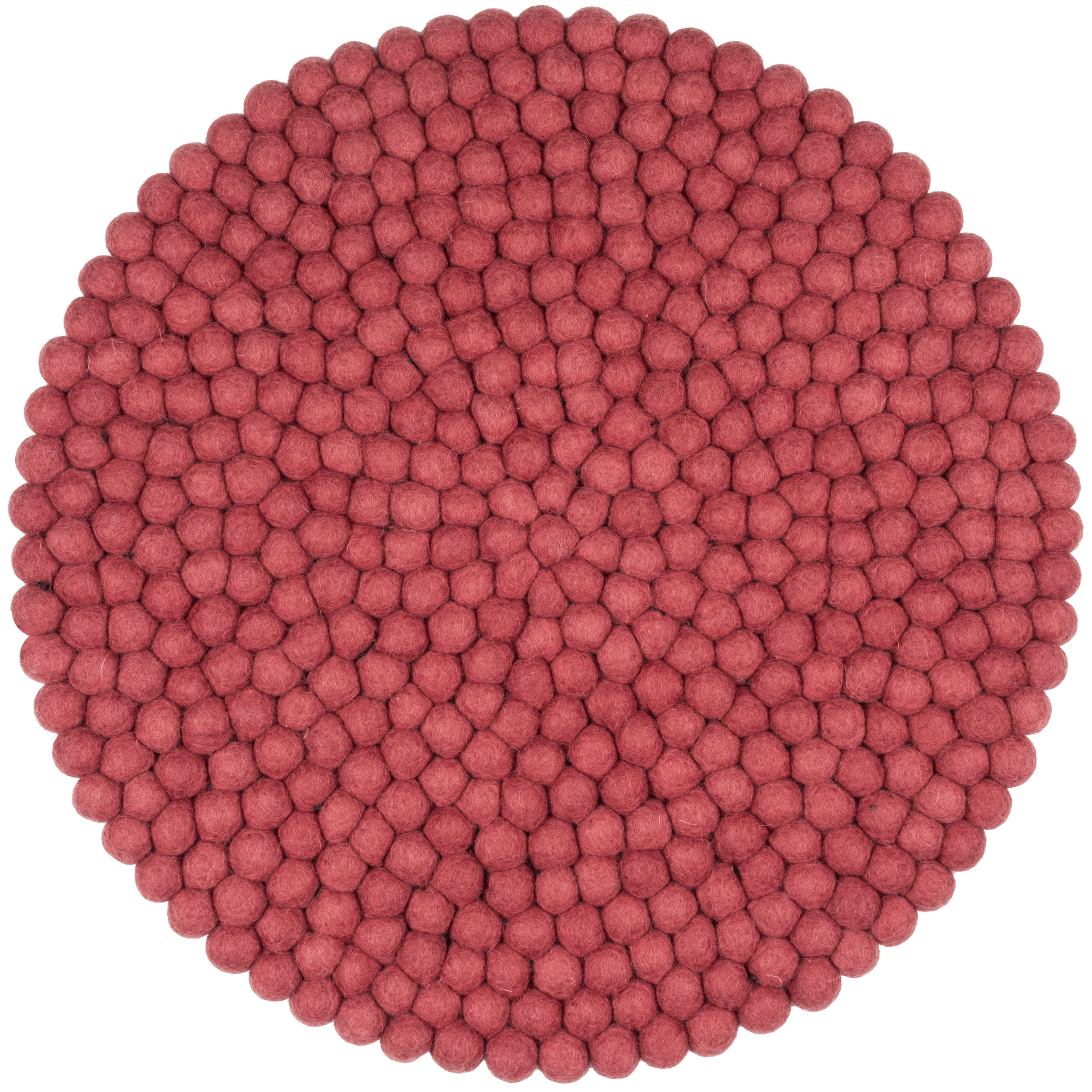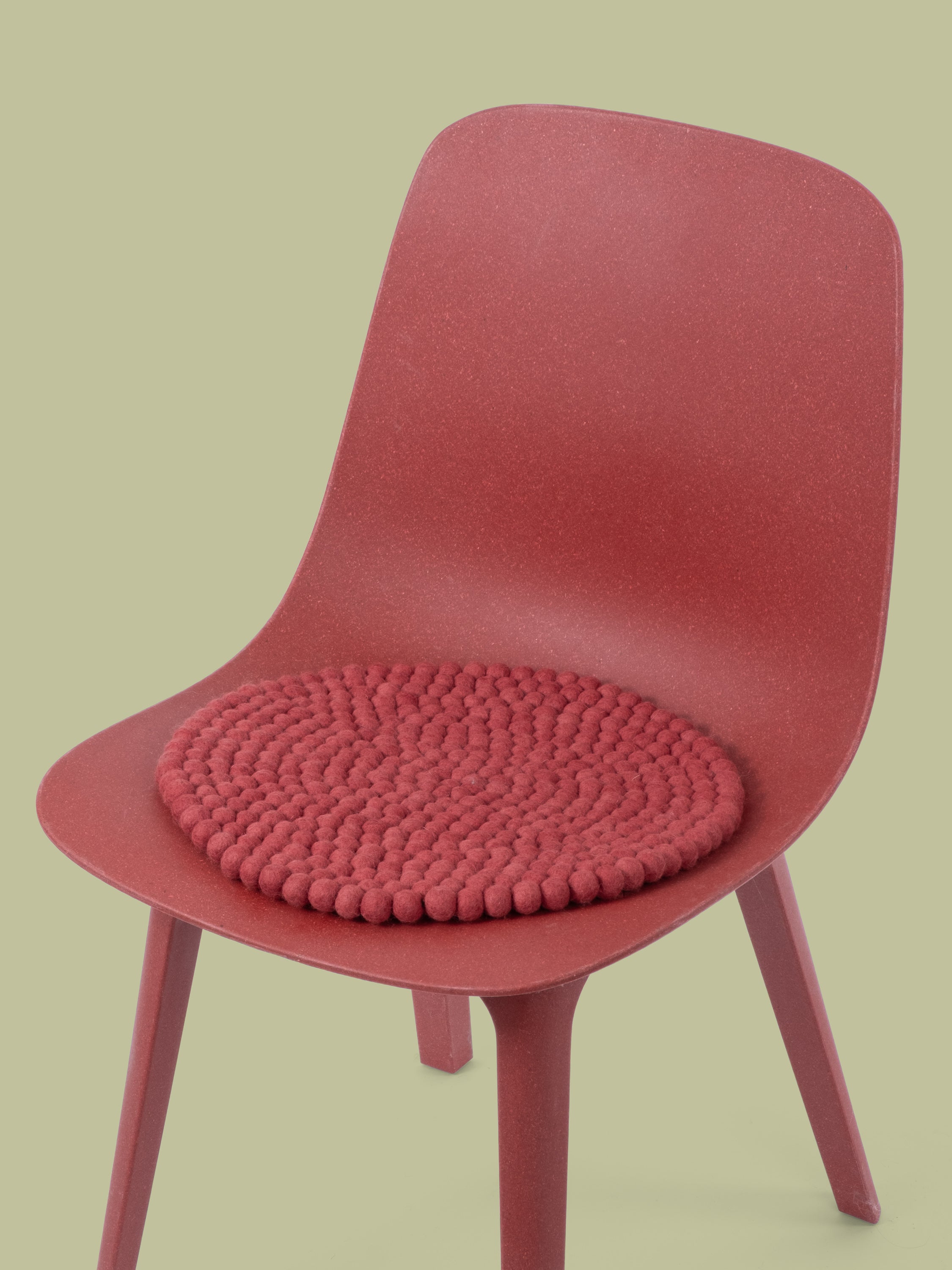Runde, weinrote Sitzauflage aus reiner Schurwolle.