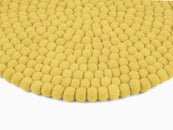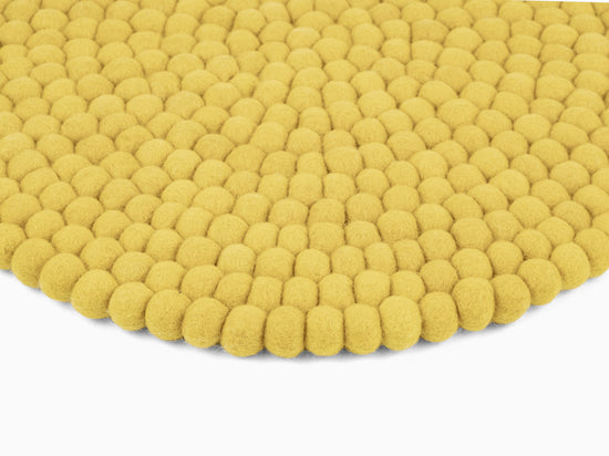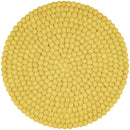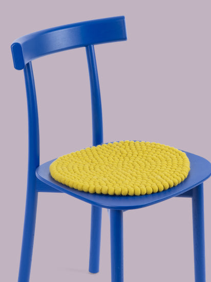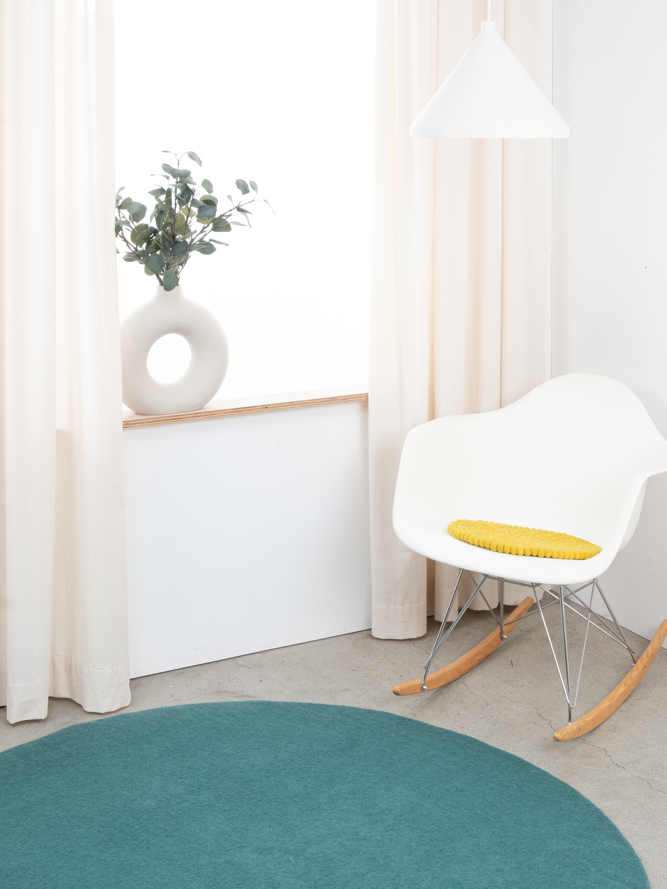 Runde, grüngelbe Sitzauflage aus reiner Schurwolle.