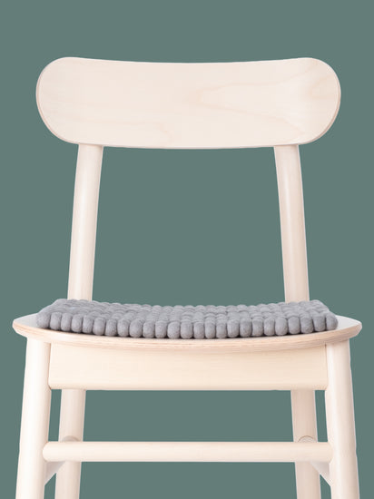 Quadratische, graue Sitzauflage aus reiner Schurwolle.