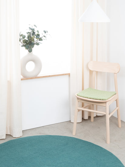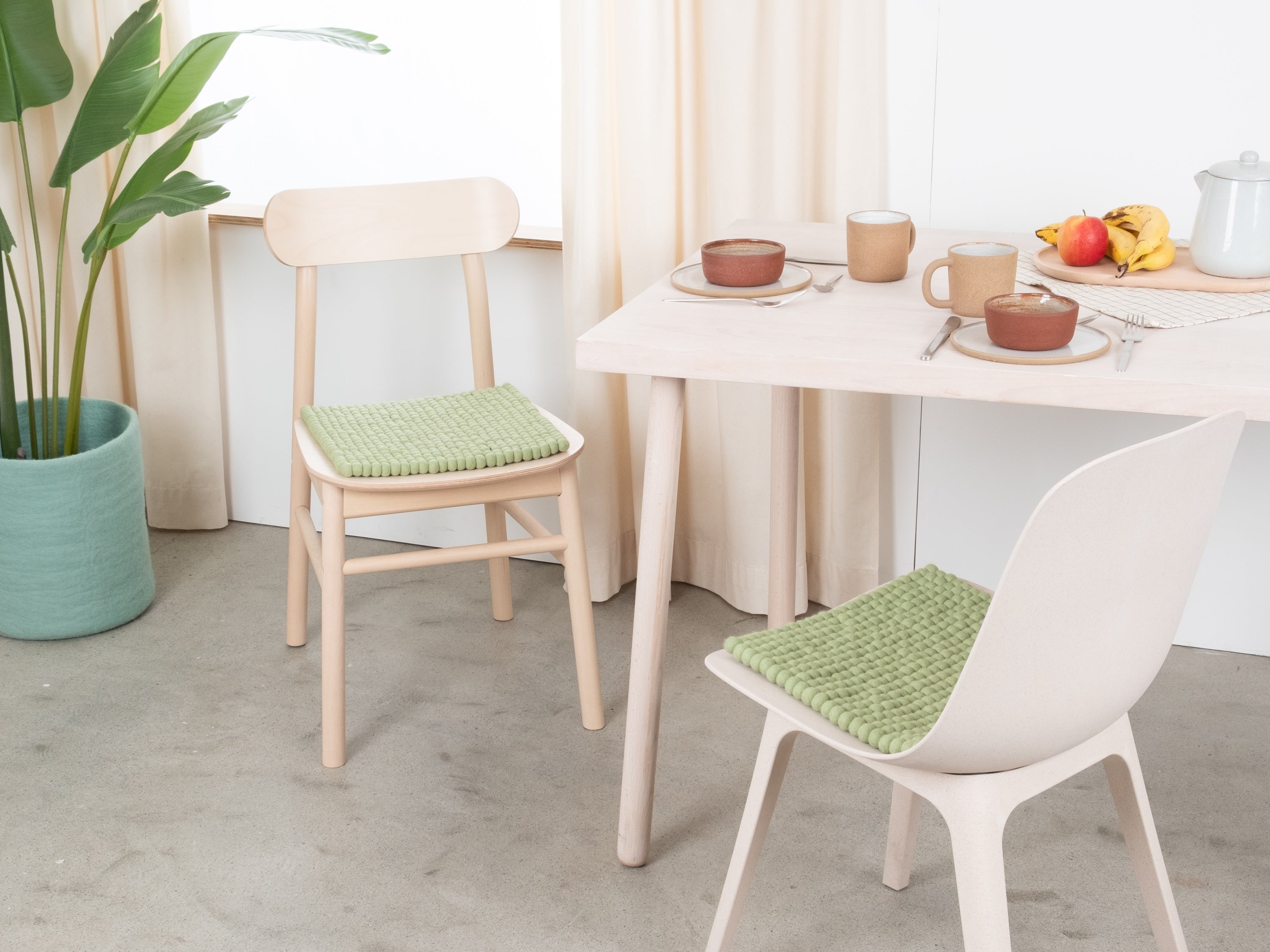 Die hellgrüne Sitzauflage Lasse bringt Wärme und Weichheit auf deinen Lieblingsstuhl. Gefertigt aus reiner Schurwolle, von Hand in Nepal hergestellt und unter fairen Bedingungen produziert. myfelt Sitzauflagen sind wasser- und schmutzabweisend und beidseitig verwendbar.