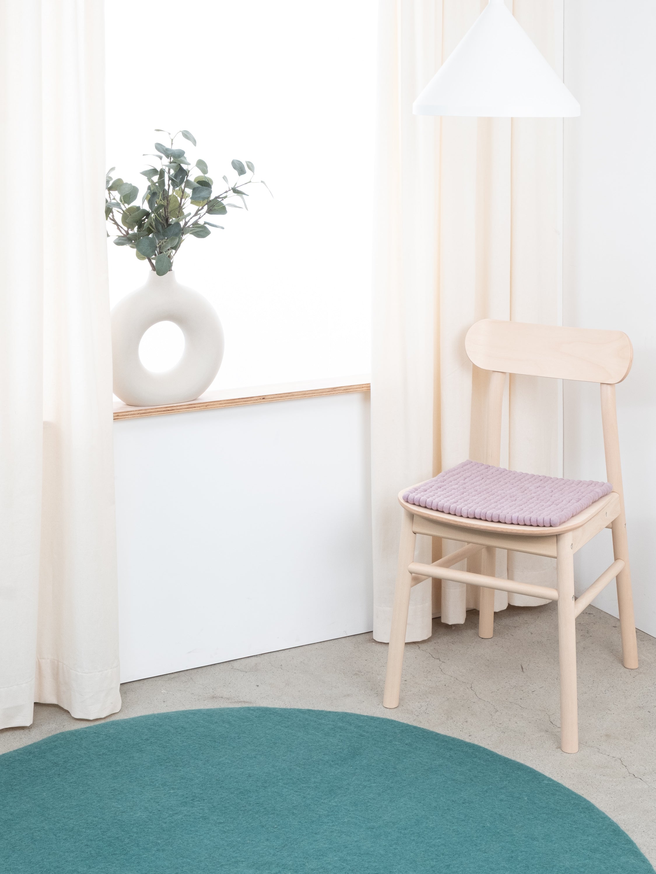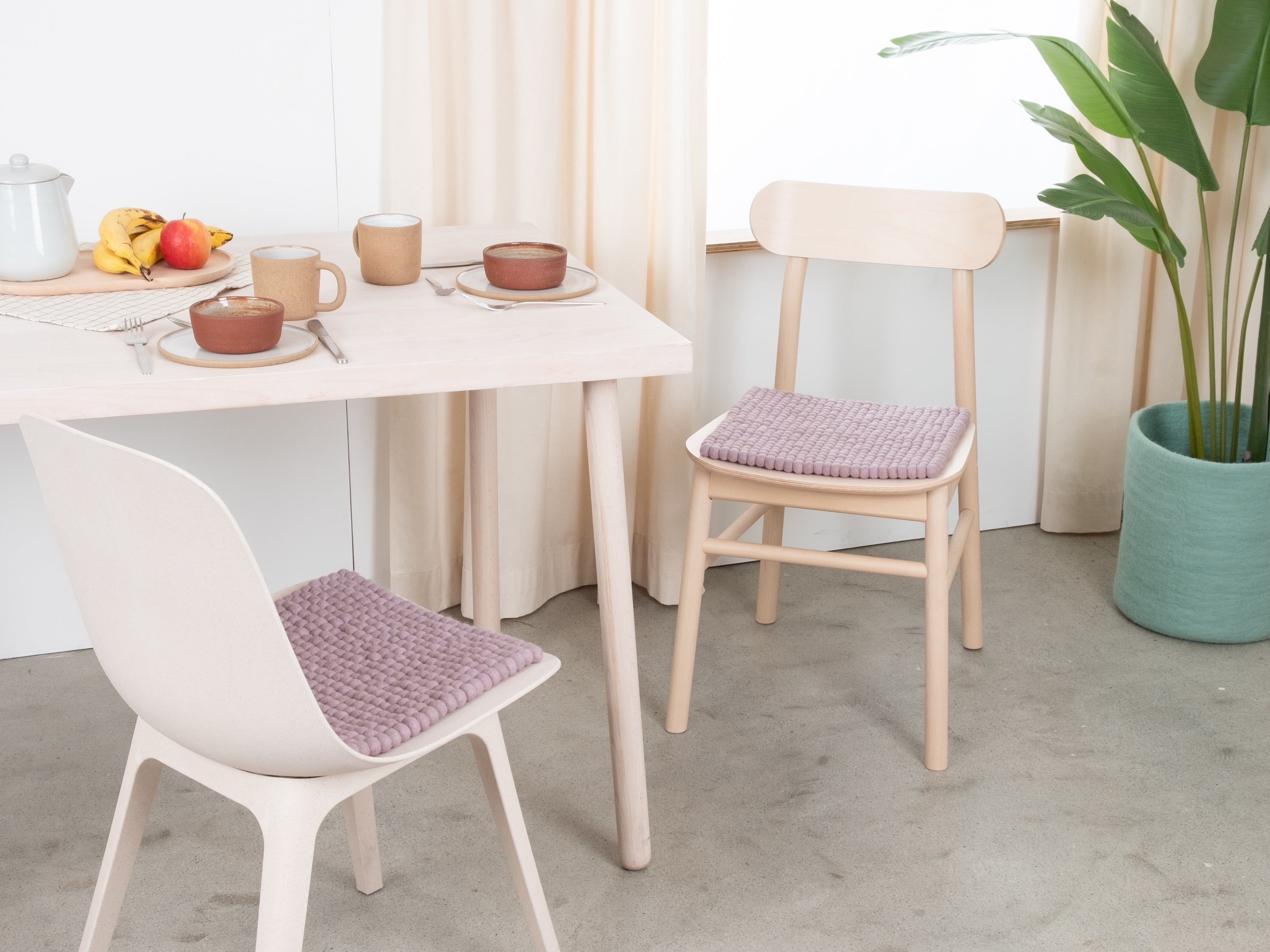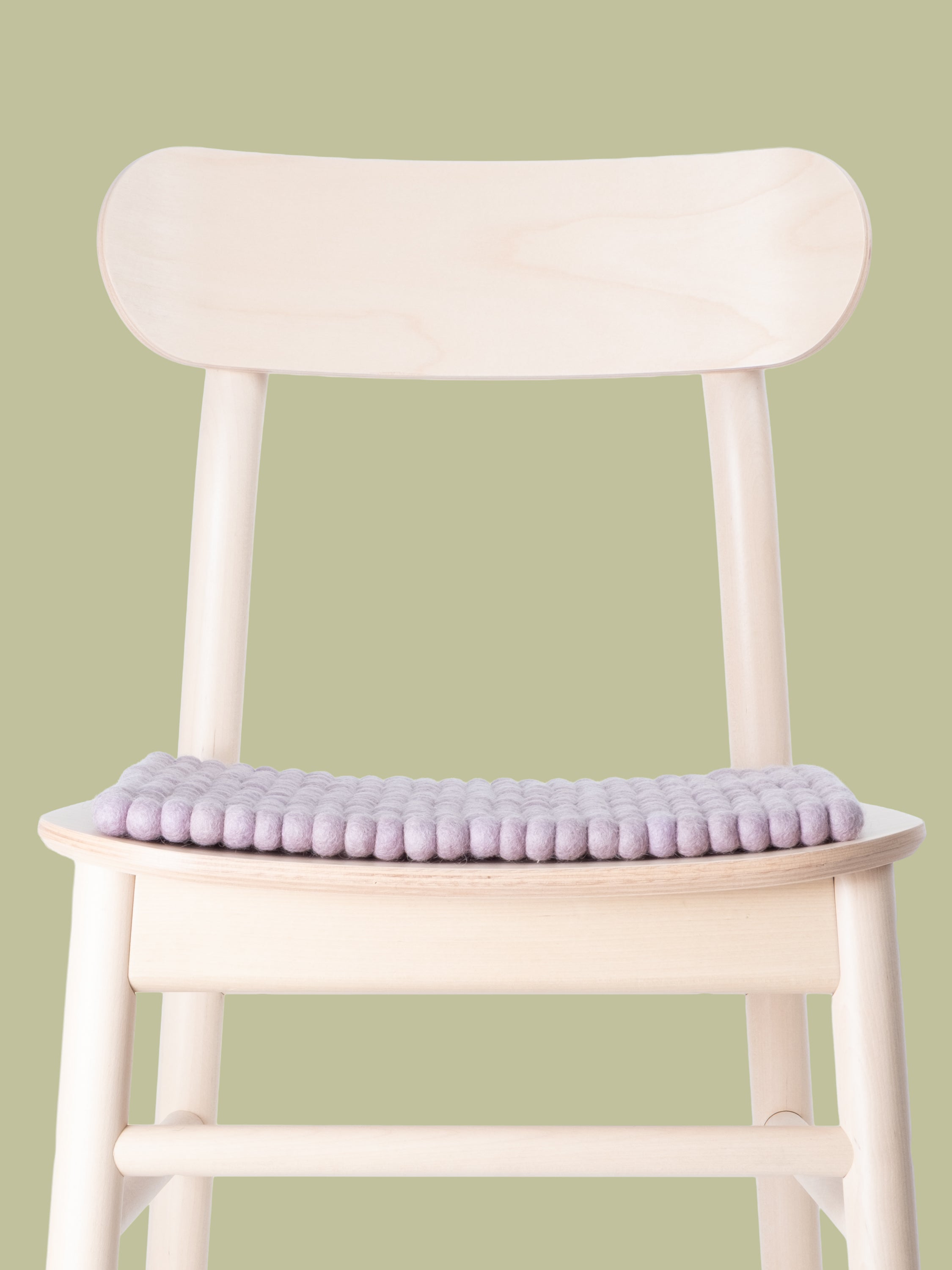 Die hellviolette Sitzauflage Marla bringt Wärme und Weichheit auf deinen Lieblingsstuhl. Gefertigt aus reiner Schurwolle, von Hand in Nepal hergestellt und unter fairen Bedingungen produziert. myfelt Sitzauflagen sind wasser- und schmutzabweisend und beidseitig verwendbar.