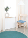 Die blaue Sitzauflage Nilo bringt Wärme und Weichheit auf deinen Lieblingsstuhl. Gefertigt aus reiner Schurwolle, von Hand in Nepal hergestellt und unter fairen Bedingungen produziert. myfelt Sitzauflagen sind wasser- und schmutzabweisend und beidseitig verwendbar.