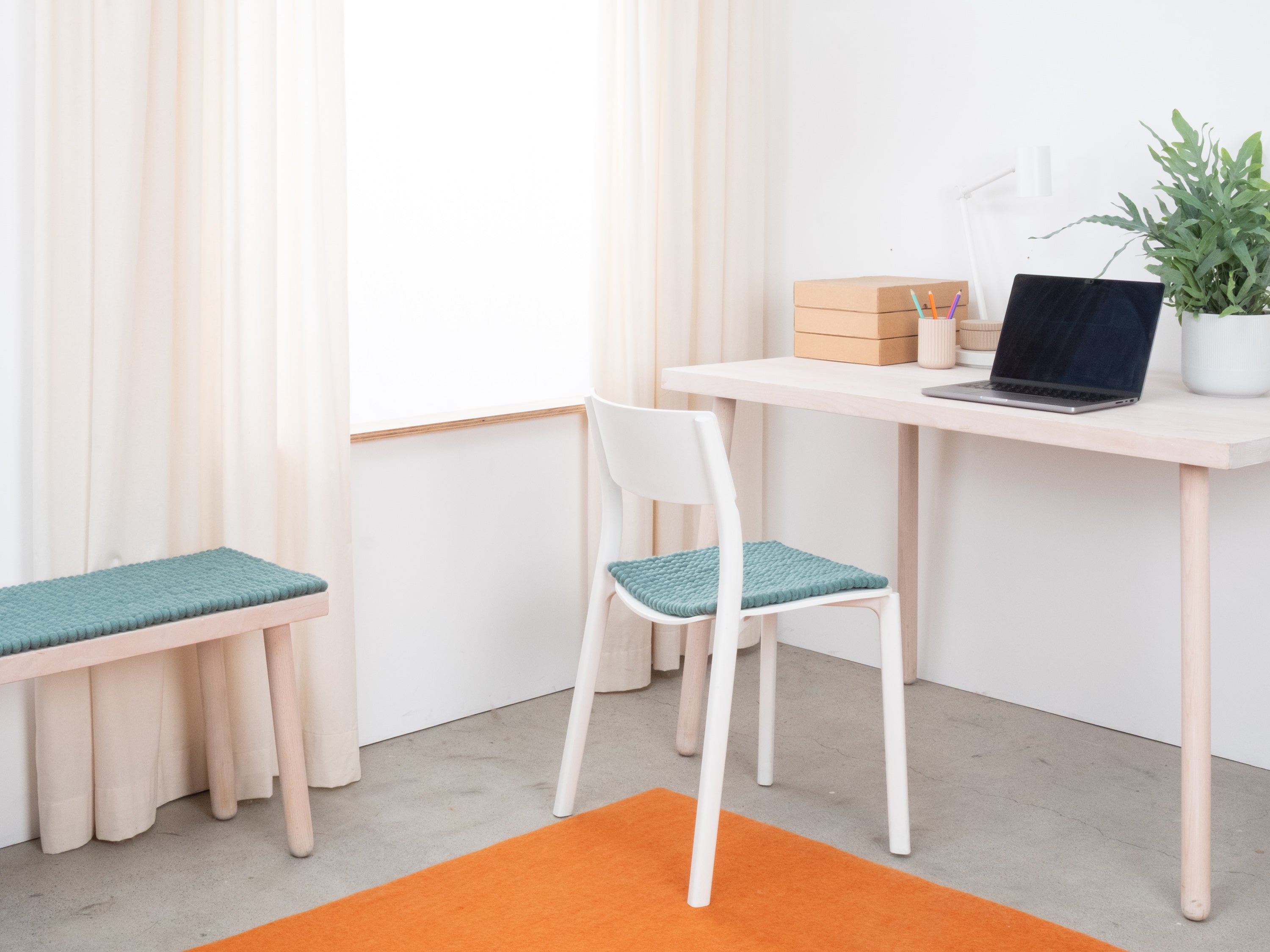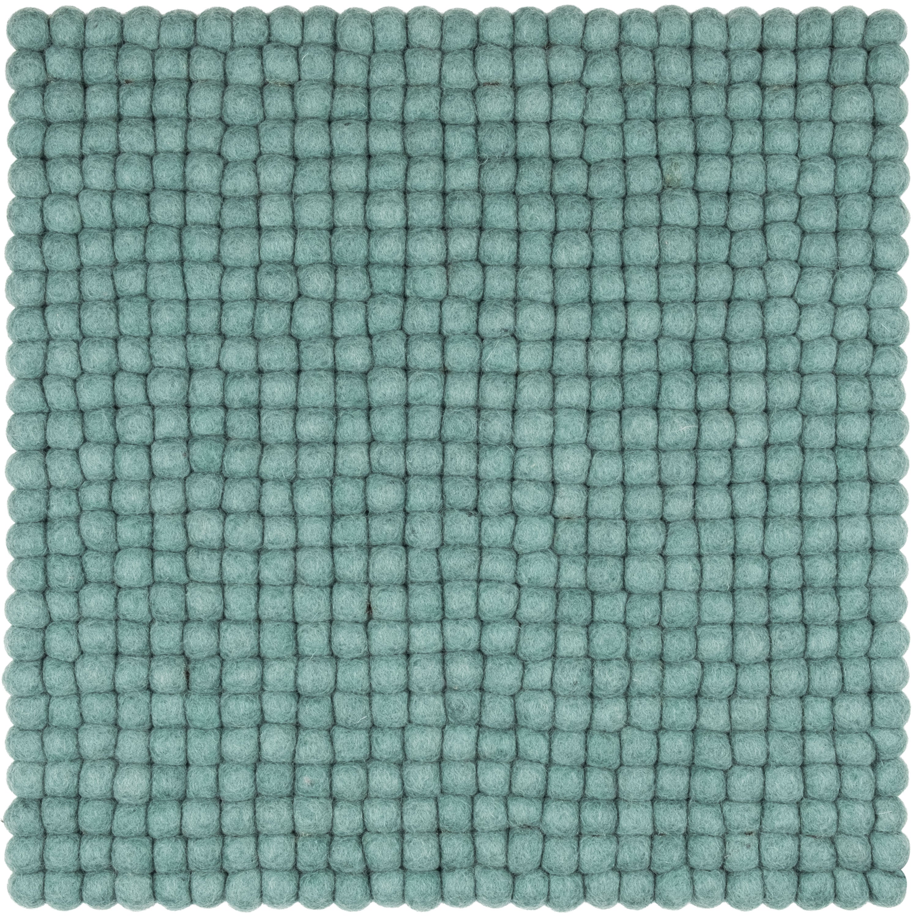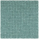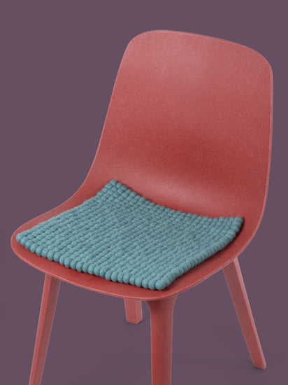 Quadratische, aquafarbene Sitzauflage aus reiner Schurwolle.