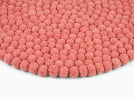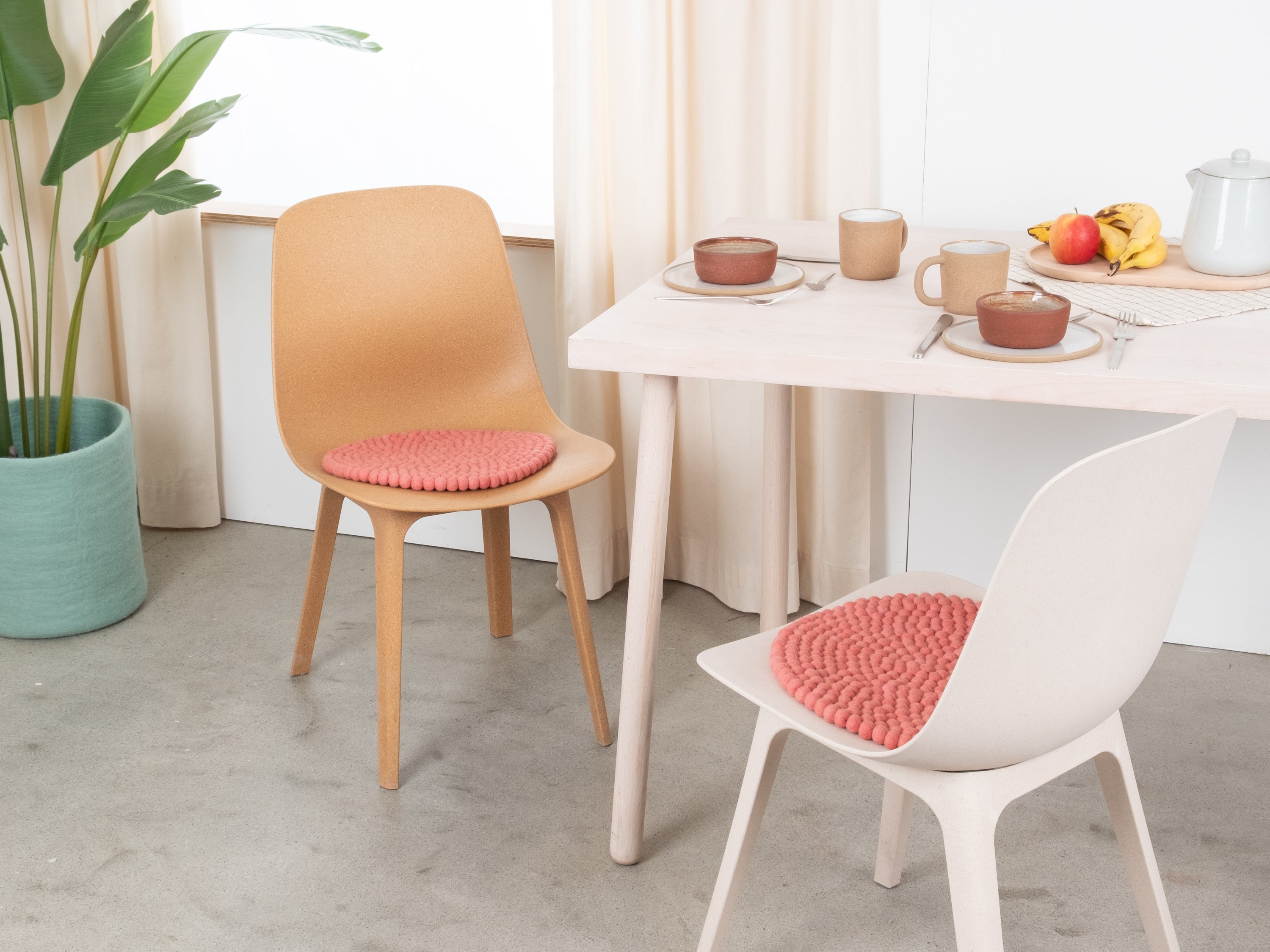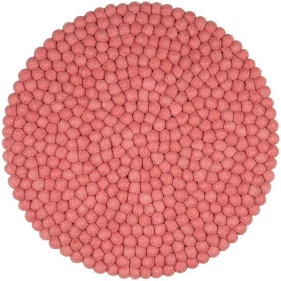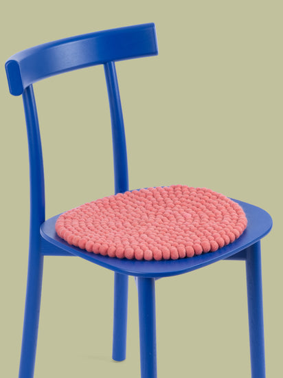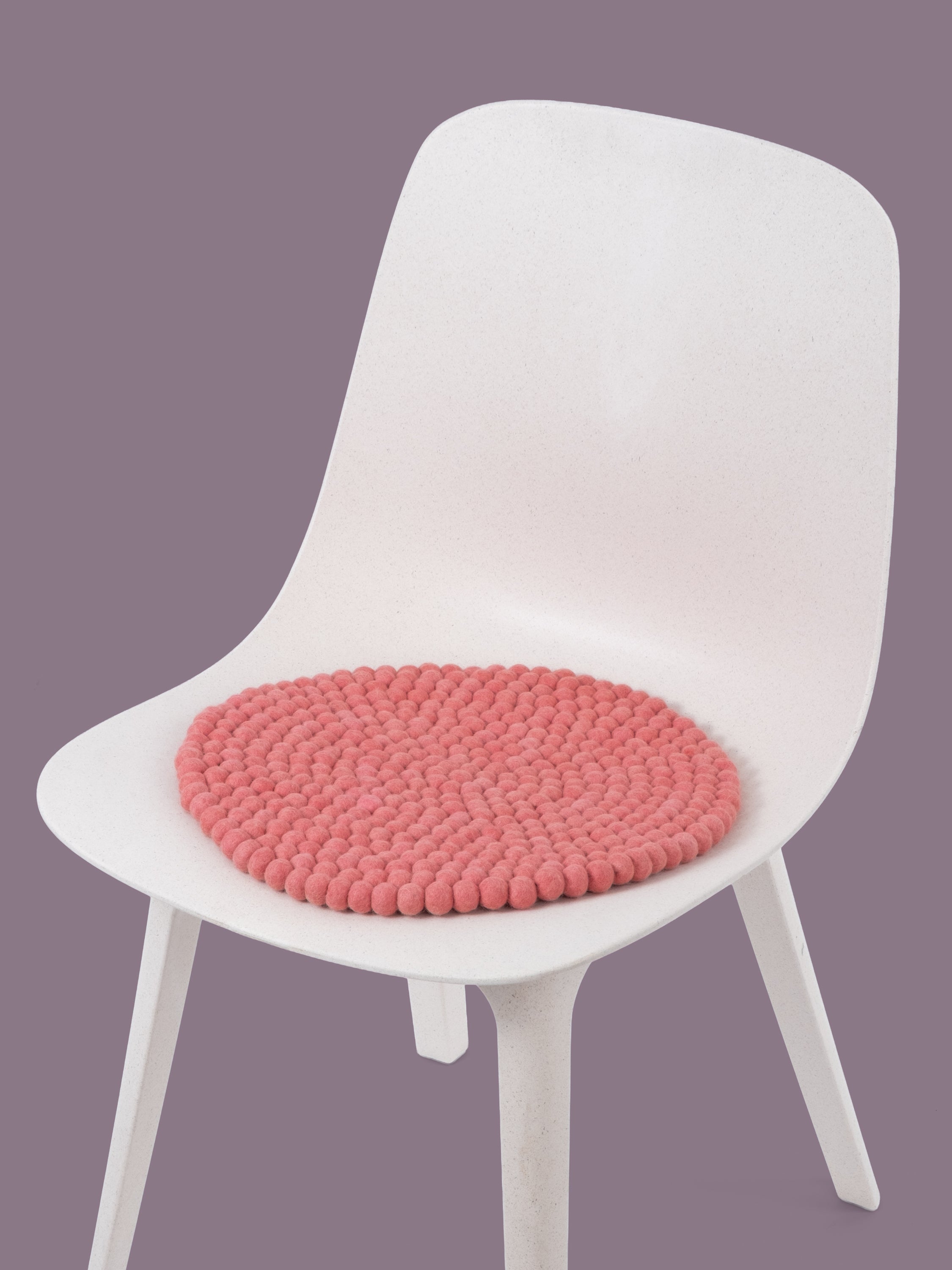 Runde, korallenrosa Sitzauflage aus reiner Schurwolle.