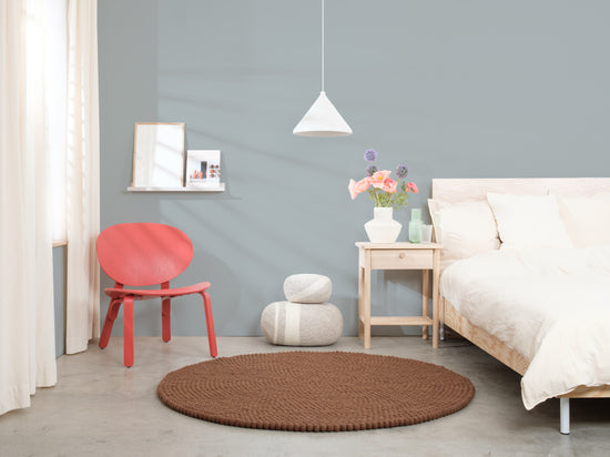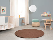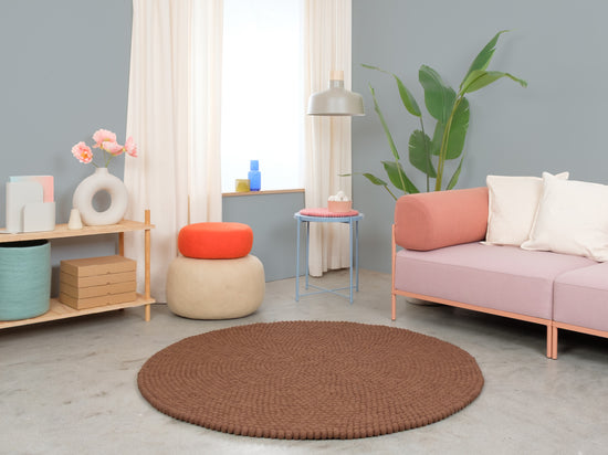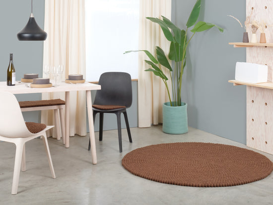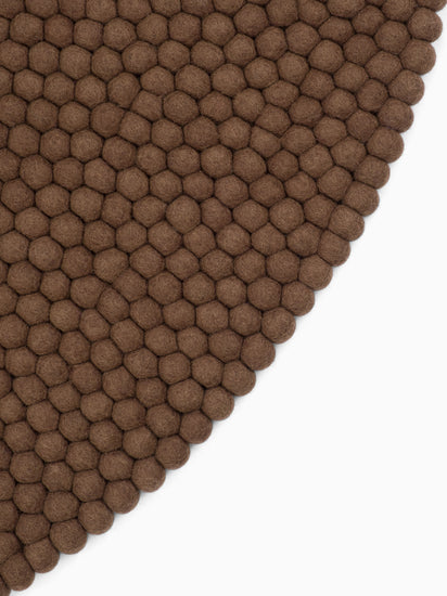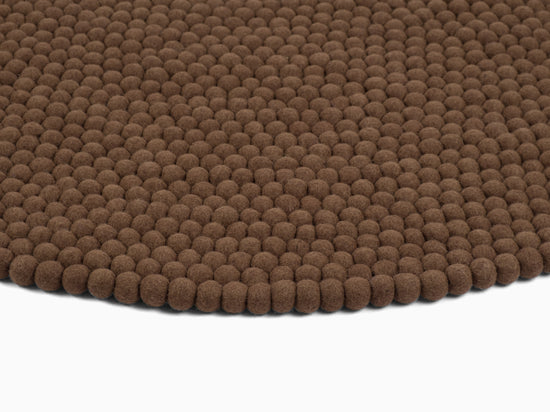 Egon setzt auf warmes Schokobraun. Der Filzkugelteppich erdet jeden Raum, schafft Behaglichkeit und Struktur. Ideal für Leseecken und Wohnbereiche, die Wärme vertragen. Strapazierfähig, formstabil, angenehm unter den Füßen. Handarbeit aus Nepal – 100 % reine Schurwolle.
