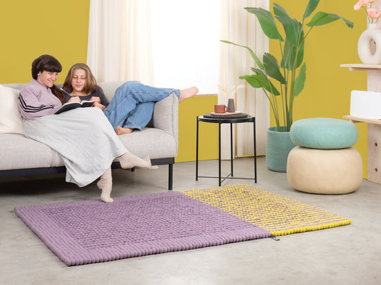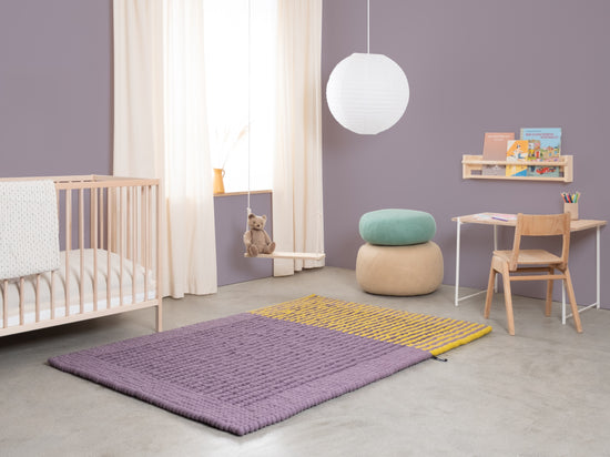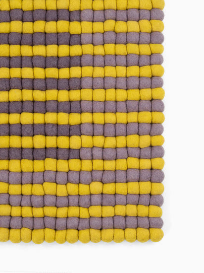 Rechteckiger Filzkugelteppich, hergestellt aus reiner Schurwolle.