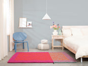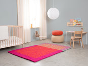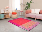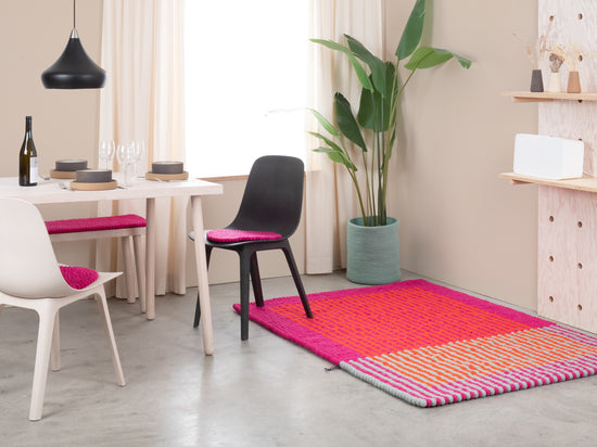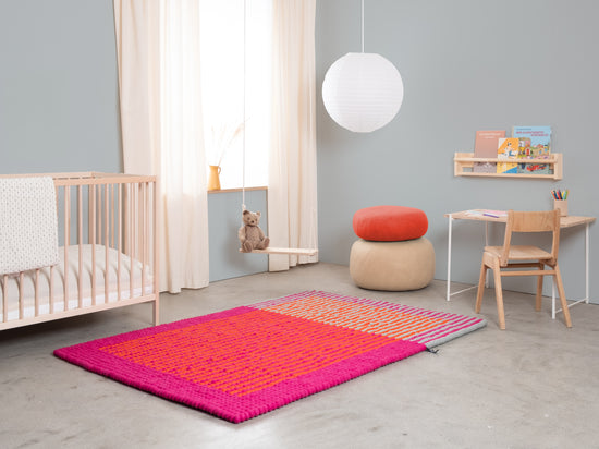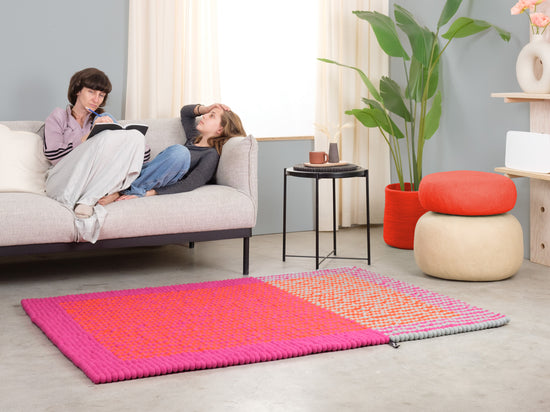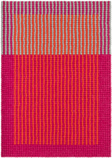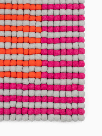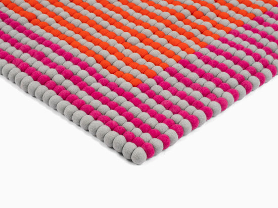 Rechteckiger Filzkugelteppich, hergestellt aus reiner Schurwolle.