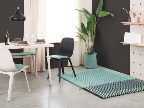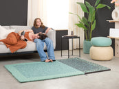 Kühle Blautöne treffen auf steiniges Grau, dazu ein Hauch von Tannengrün. Yukon erinnert an stille Landschaften, an Gletscherseen und das tiefe Blau des Nordens. Ein Teppich, der Klarheit ausstrahlt – und Ruhe mitbringt. Für alle, die den Kopf frei bekommen wollen.