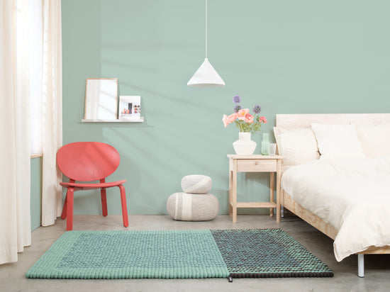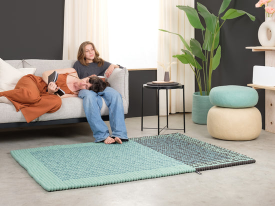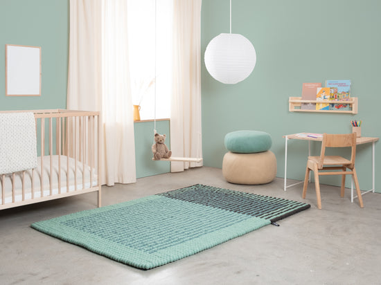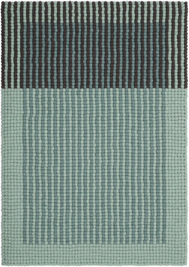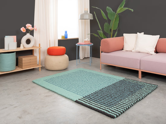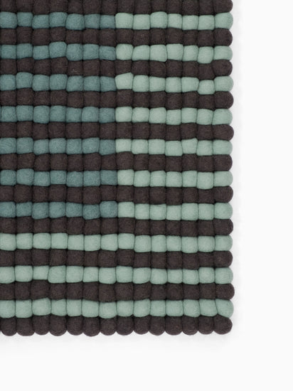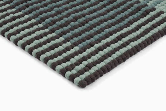 Rechteckiger Filzkugelteppich, hergestellt aus reiner Schurwolle.