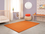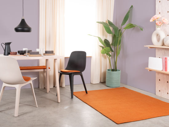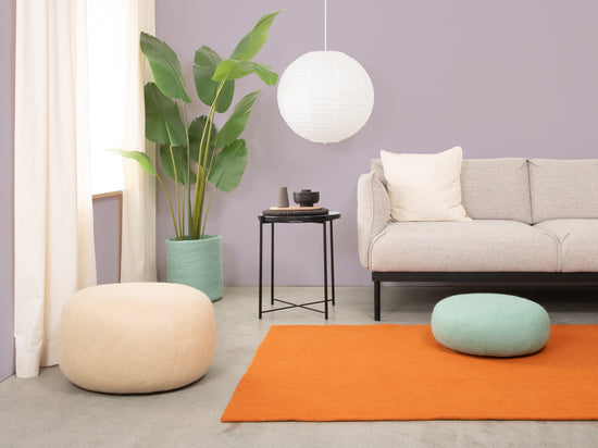 Afra bringt ein warmes Orange in den Raum. Der Filzteppich wirkt einladend und energiegeladen, ohne laut zu werden. Perfekt, um kühle Räume zu erwärmen oder Akzente zu setzen. Robust, pflegeleicht und angenehm im Tritt. In Nepal handgefertigt – aus 100 % reiner Schurwolle.
