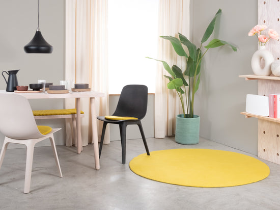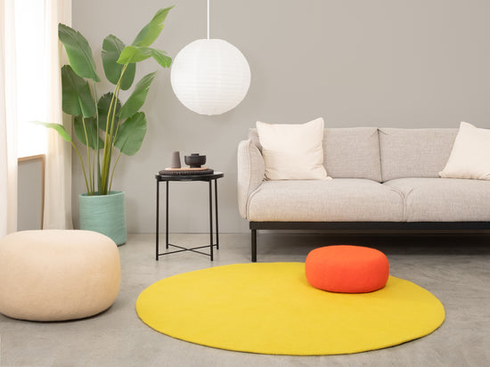 Kata ist ein Filzteppich in frischem Gelbgrün. Leuchtend, vital und voller Energie bringt er Bewegung in den Raum. Ob als fröhlicher Akzent im Wohnzimmer oder als Lichtpunkt im Arbeitsbereich. Kata sorgt für Lebendigkeit und Leichtigkeit. Weich, robust und pflegeleicht. Handgefertigt in Nepal aus 100 % reiner Schurwolle.