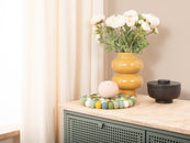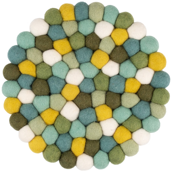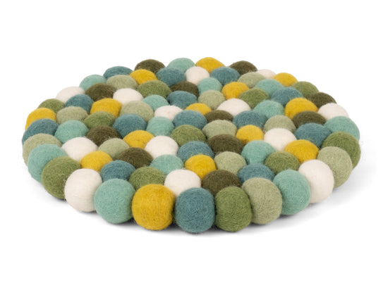Der Topfuntersetzer Finn in den Farben Grün, Türkis und Weiß verbindet Funktion mit charmanter Optik. Robust, hitzebeständig, wasser- und schmutzabweisend sowie beidseitig verwendbar. Gefertigt aus reiner Schurwolle, von Hand in Nepal hergestellt und unter fairen Bedingungen produziert.
