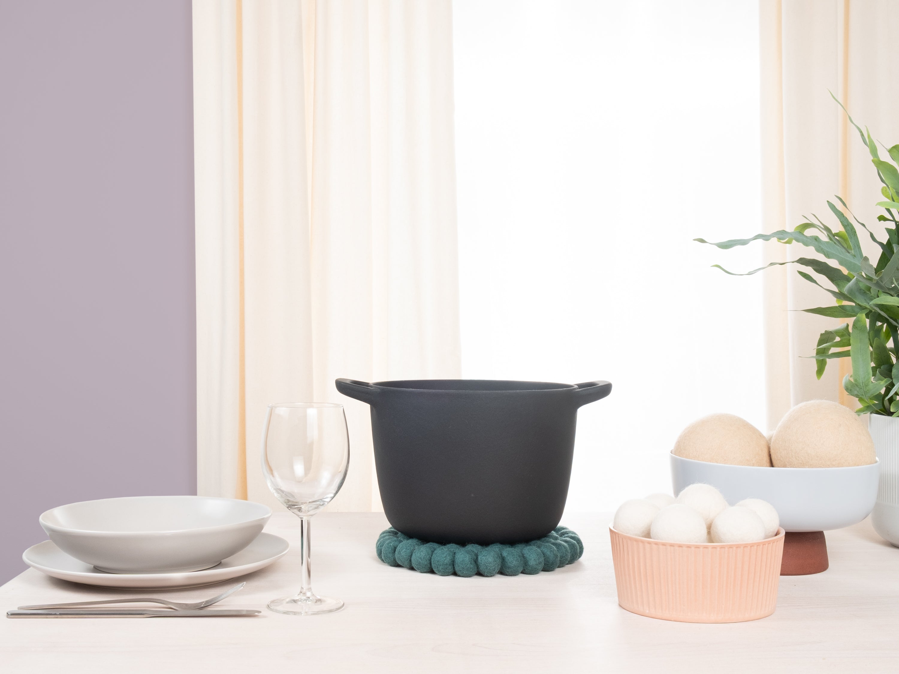 Der Topfuntersetzer Noah in der Farbe Petrol verbindet Funktion mit charmanter Optik. Robust, hitzebeständig, wasser- und schmutzabweisend sowie beidseitig verwendbar. Gefertigt aus reiner Schurwolle, von Hand in Nepal hergestellt und unter fairen Bedingungen produziert.