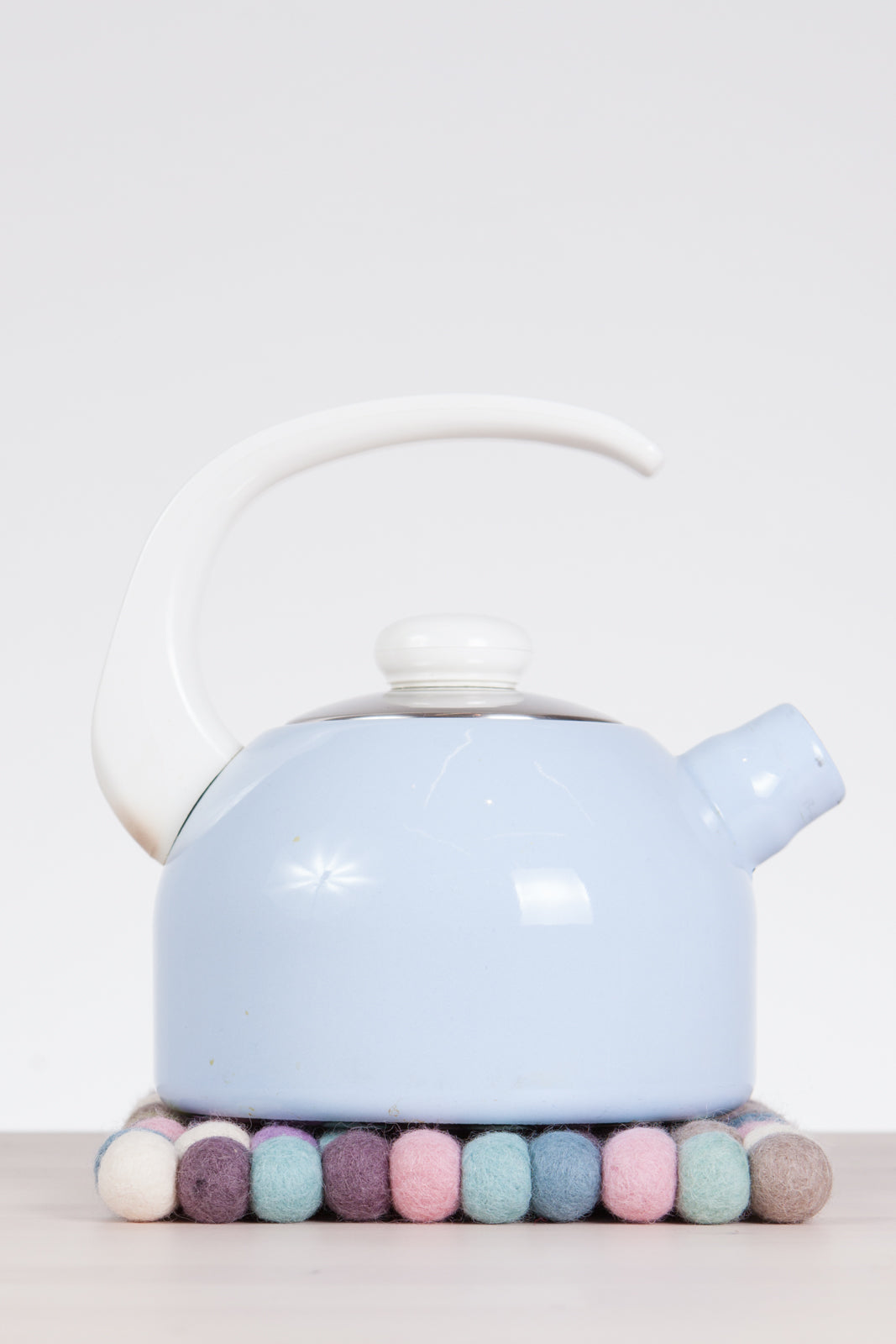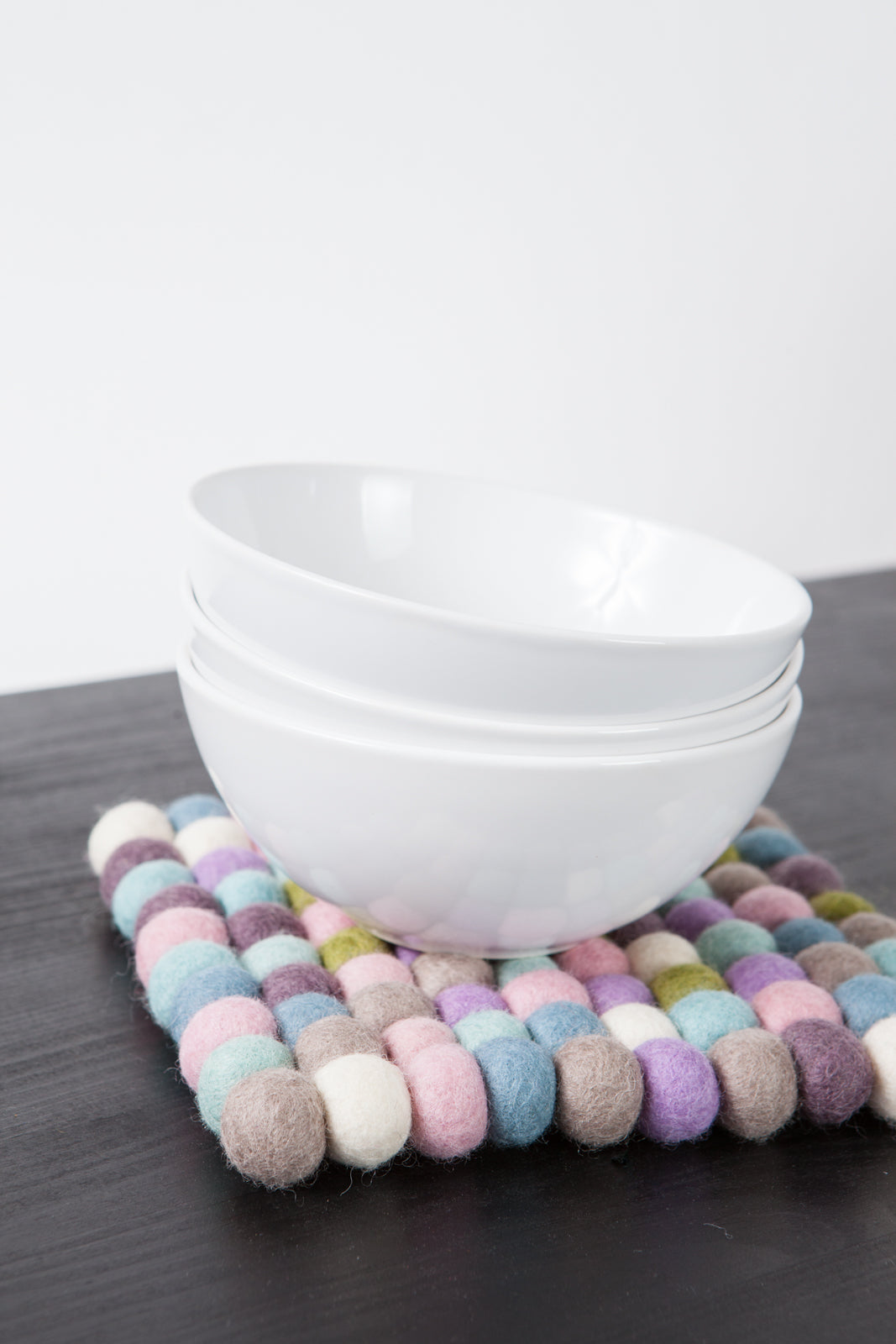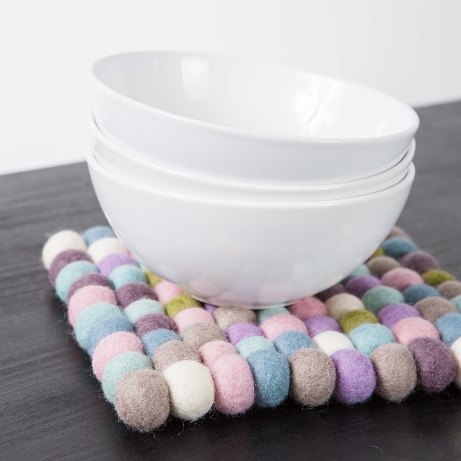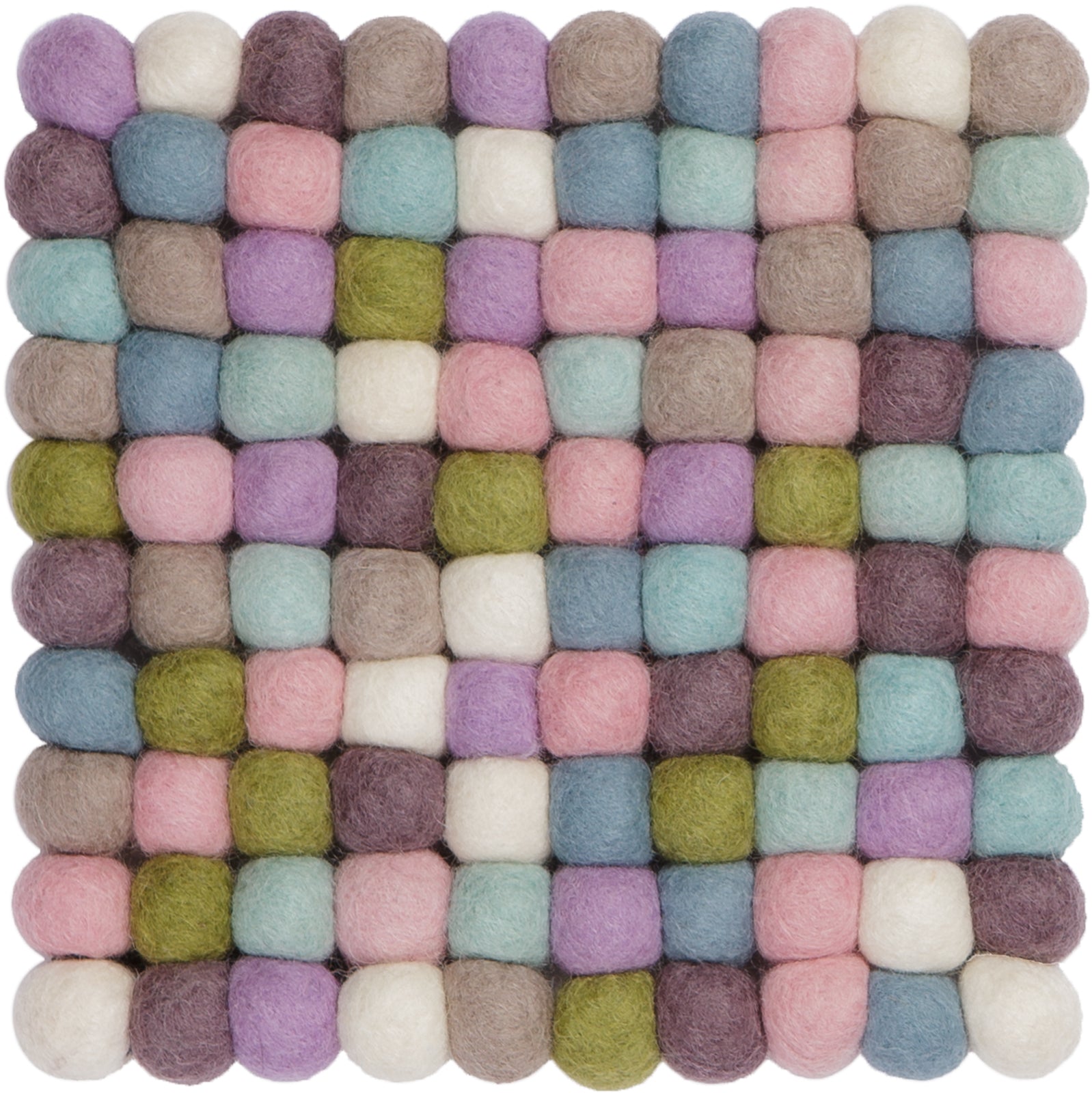 Quadratischer, mehrfarbiger Topfuntersetzer hergestellt aus reiner Schurwolle.